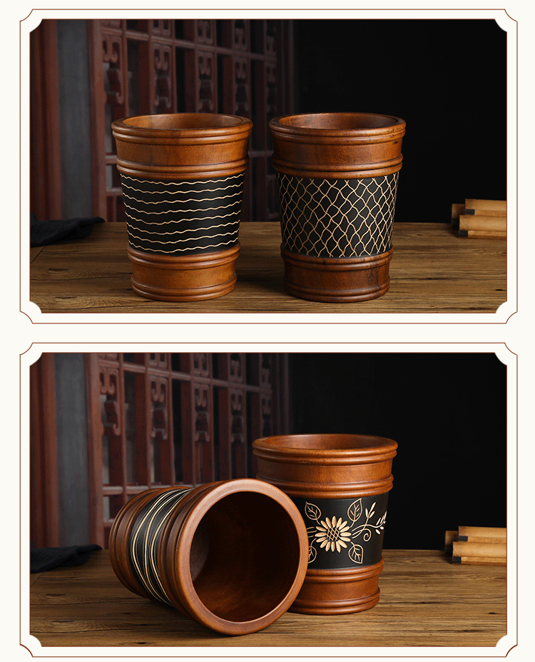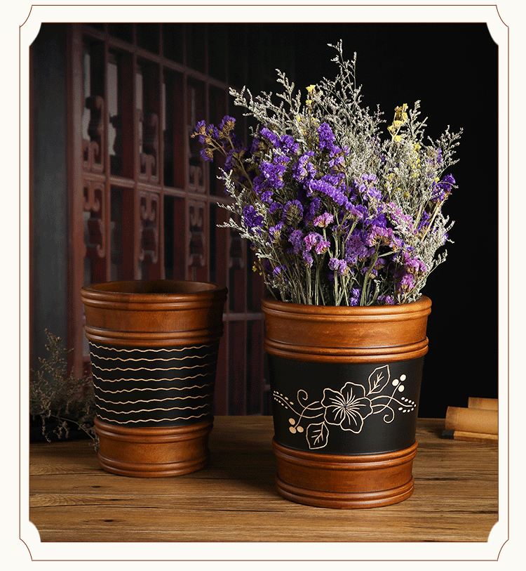 實木雕花垃圾桶客廳創意復古垃圾簍酒店圓形紙簍大號無蓋1入