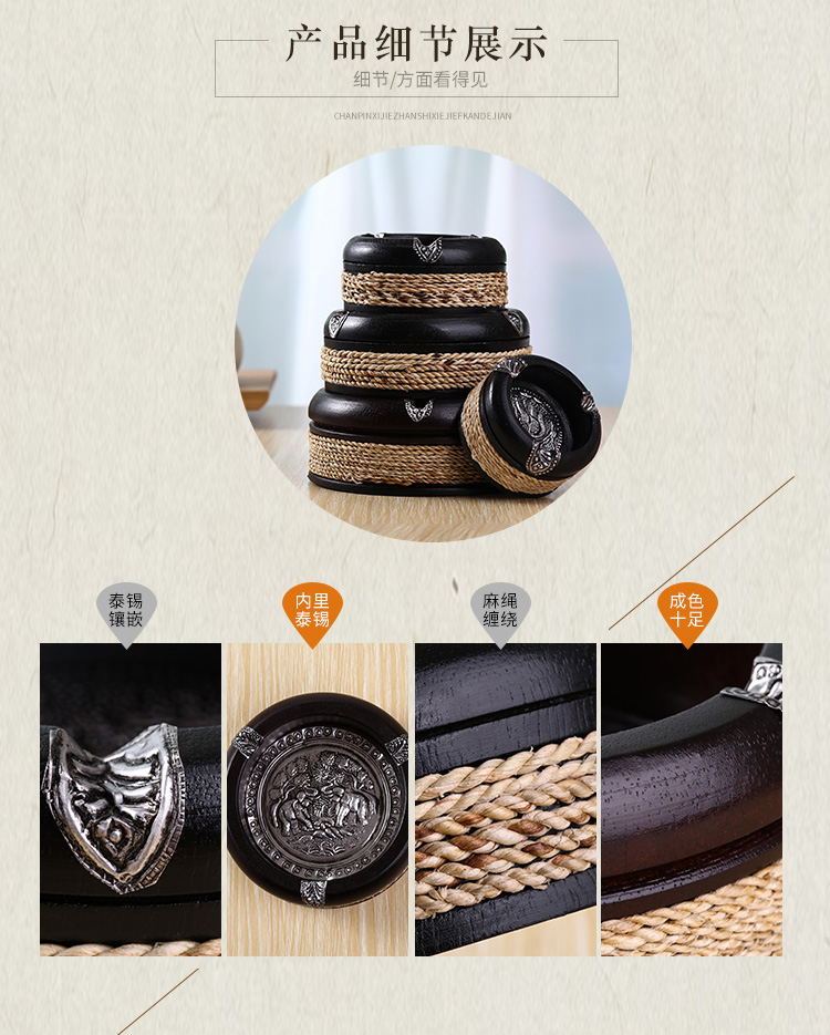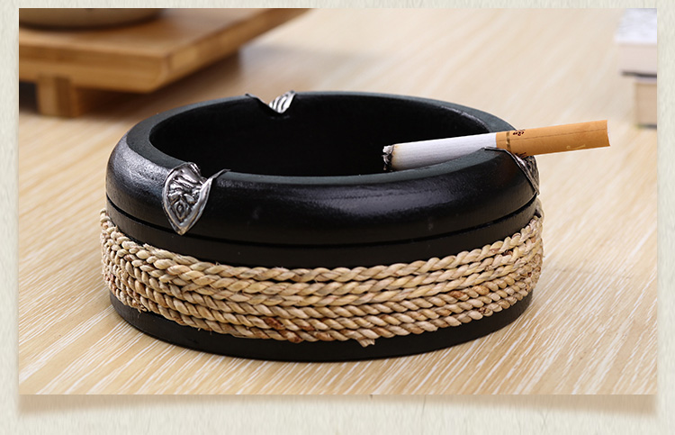 手工制作芒果木鑲嵌泰錫麻繩藝術煙灰缸草編創意實木送禮1入