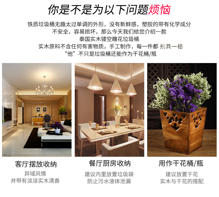 實木垃圾桶家用客廳復古創意收納桶東南亞縷空雕刻干花桶紙簍1入