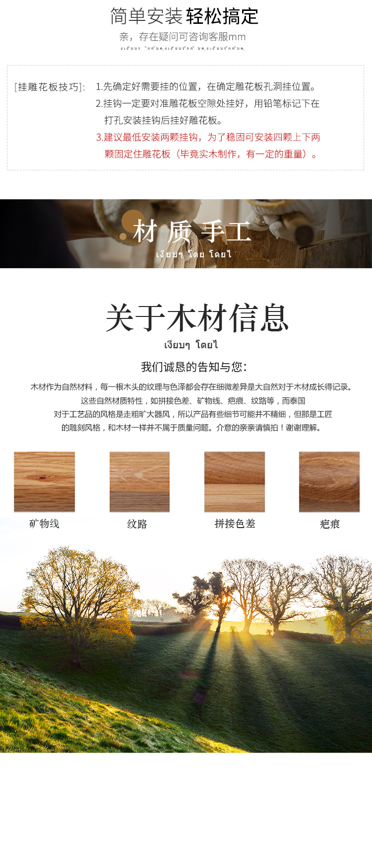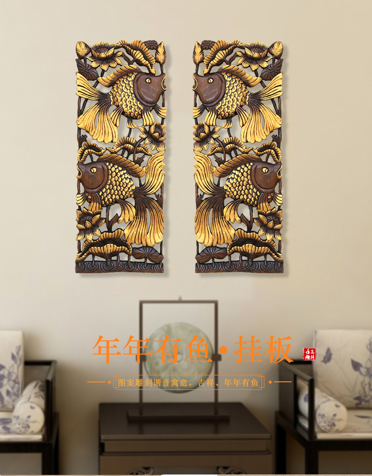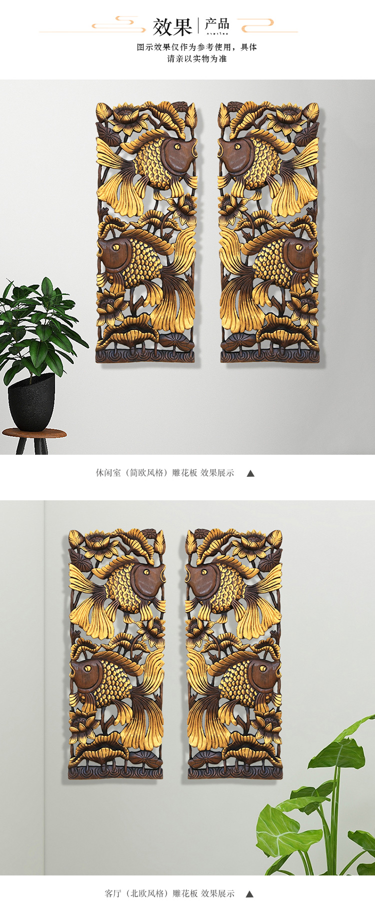 雕花板柚木荷花金色魚鏤空木雕板墻飾掛件壁掛家居玄關裝飾品1入