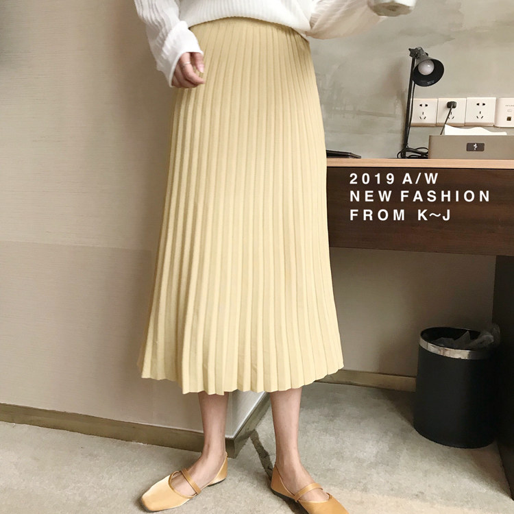 韓版秋裝 女甜美可愛淑女風純色高腰百褶中長款半身裙1入