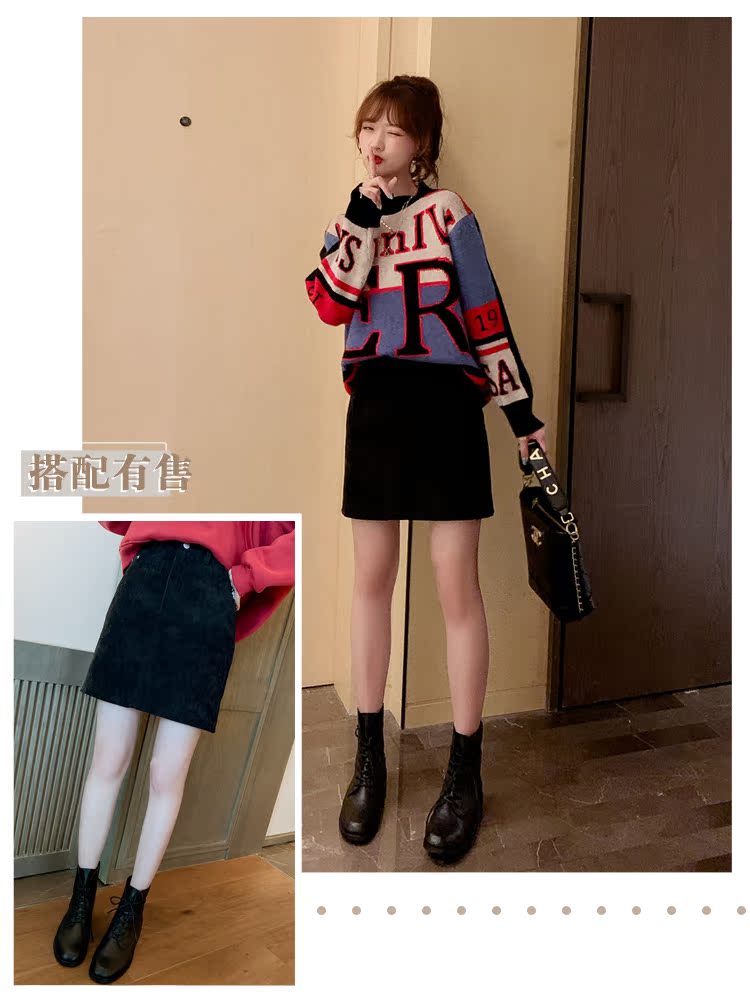 2019秋裝時髦百搭字母印花撞色毛衣針織衫女韓版寬松長袖上衣1入