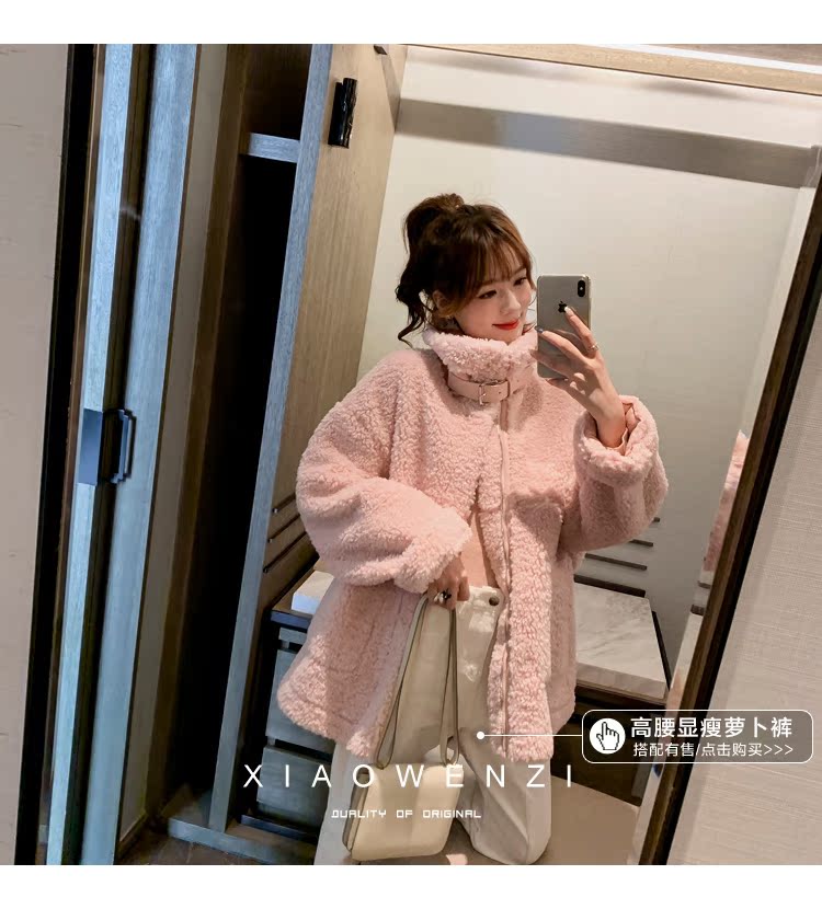2019冬季女韓版寬松皮毛一體羊羔毛外套百搭立領短款棉服大衣1入