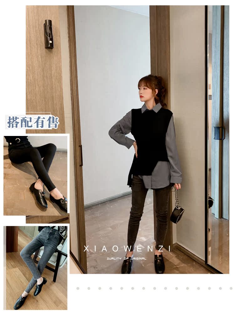 韓版寬松長袖襯衫時尚馬甲上衣兩件套女秋季2019減齡洋氣套裝1入