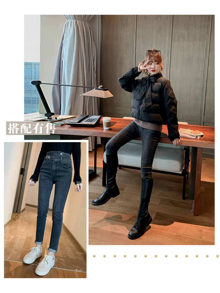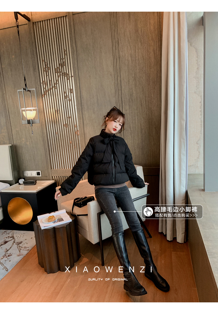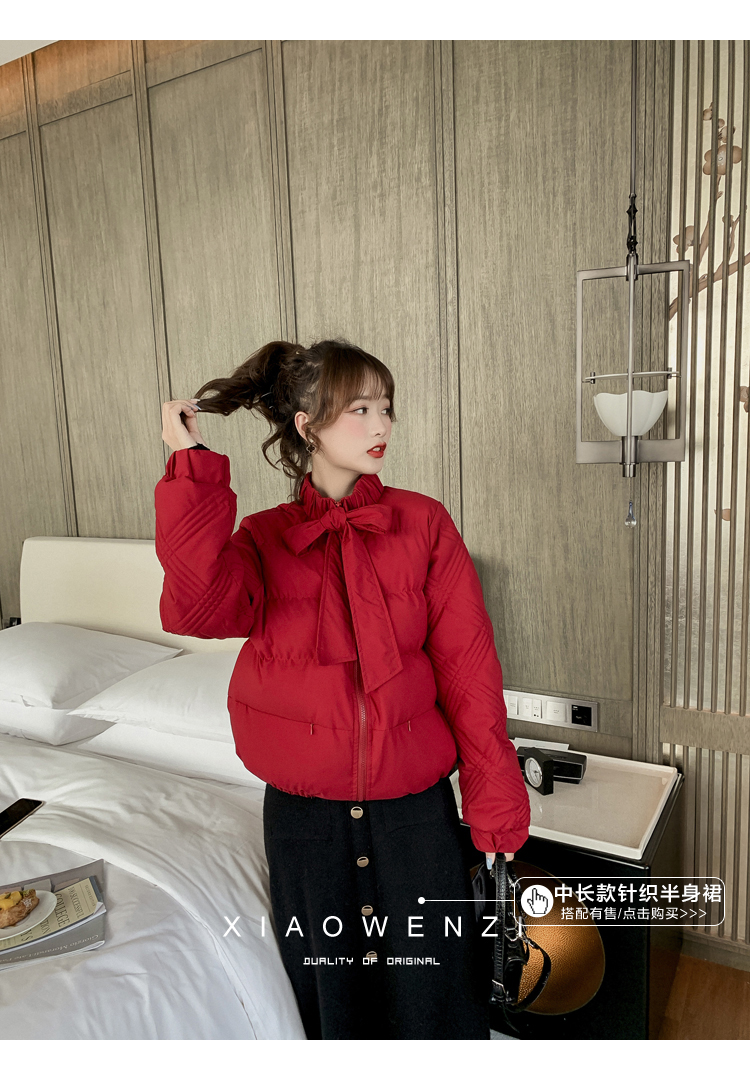 2019冬季女韓版寬松外套上衣立領蝴蝶結系帶短款棉衣加厚棉襖1入