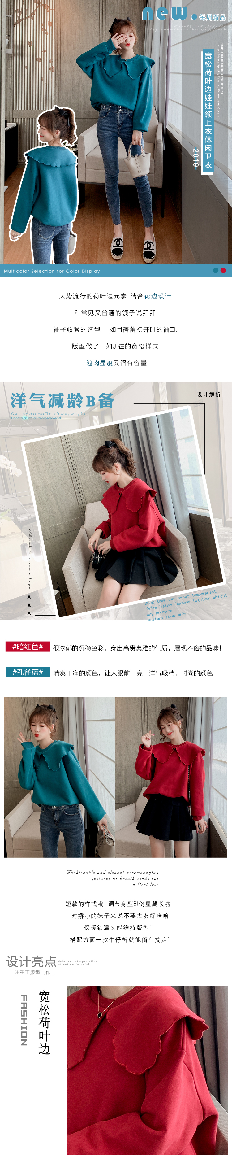 韓版寬松荷葉邊娃娃領上衣女秋裝2019時尚百搭休閑套頭衛衣潮1入