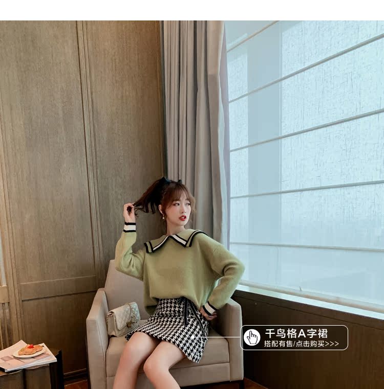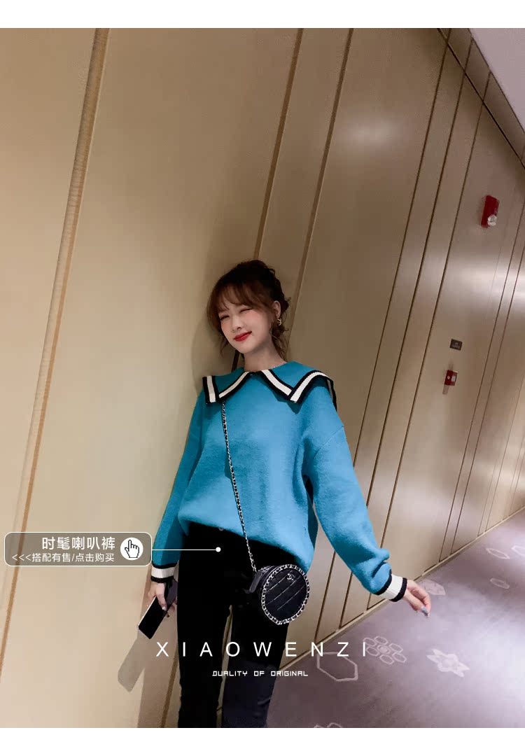 2019秋季學院風海軍領拼色學生毛衣女韓版寬松針織衫長袖上衣1入