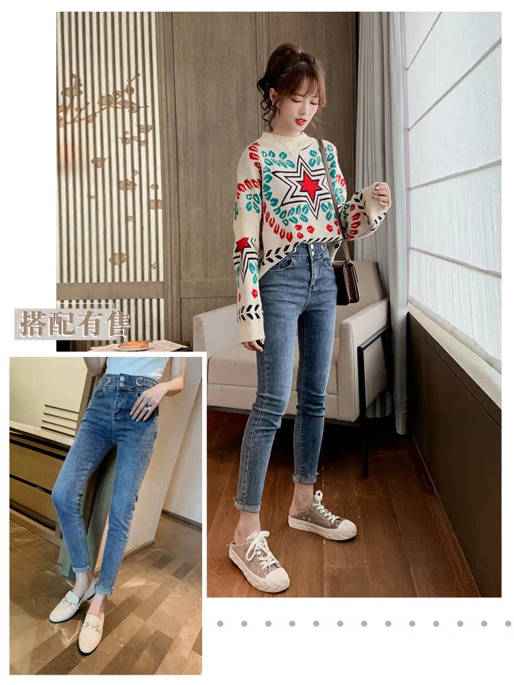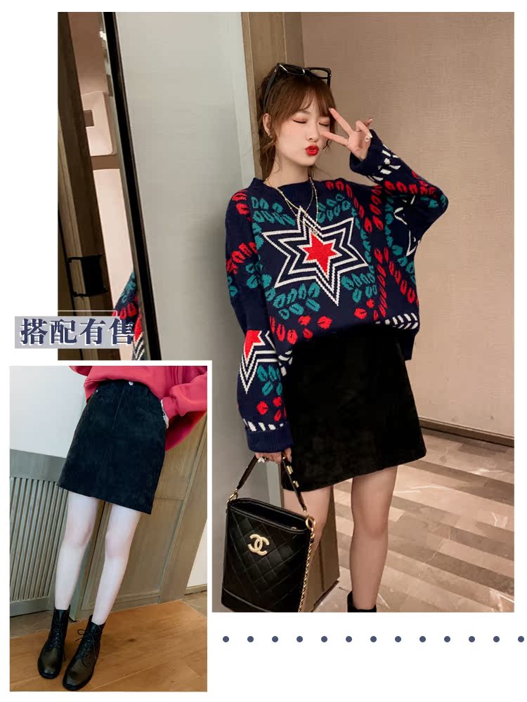 2019裝韓版寬松慵懶休閑套頭毛衣女時尚chic提花針織上衣1入