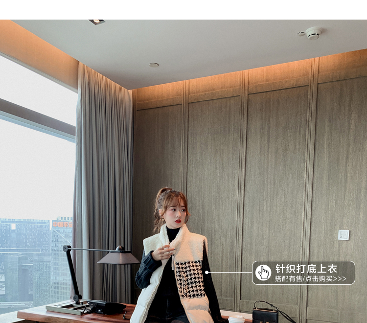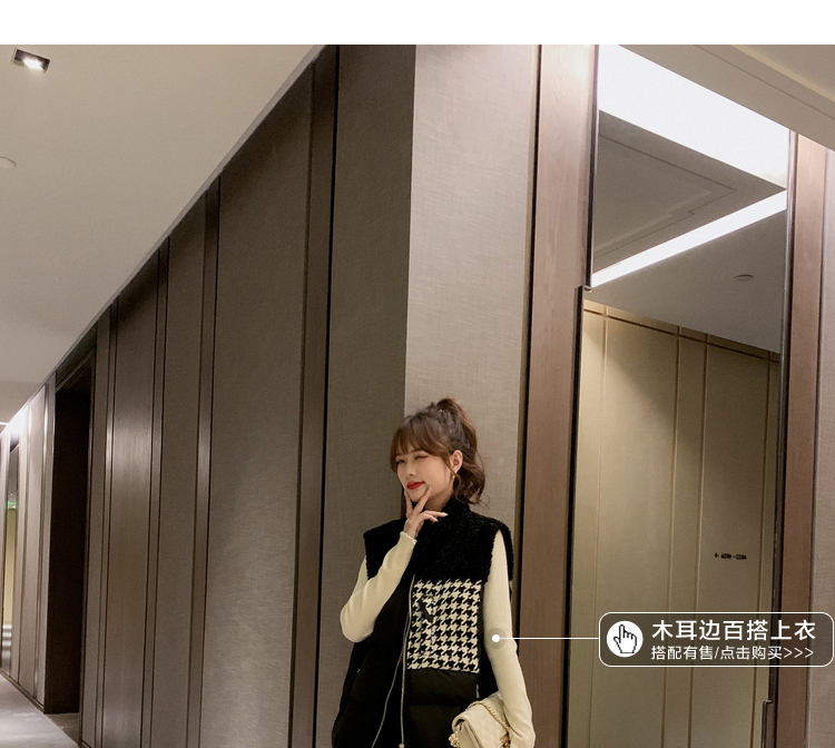 2019秋季羊羔毛拼接千鳥格棉服馬甲上衣女休閑百搭夾克短外套1入