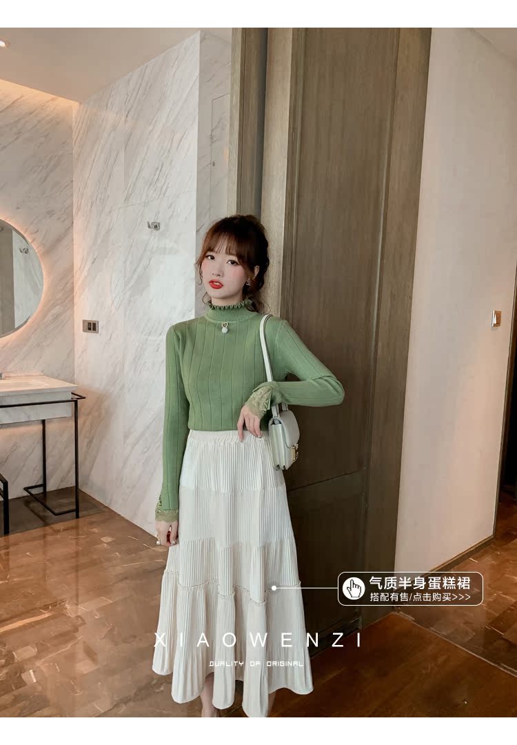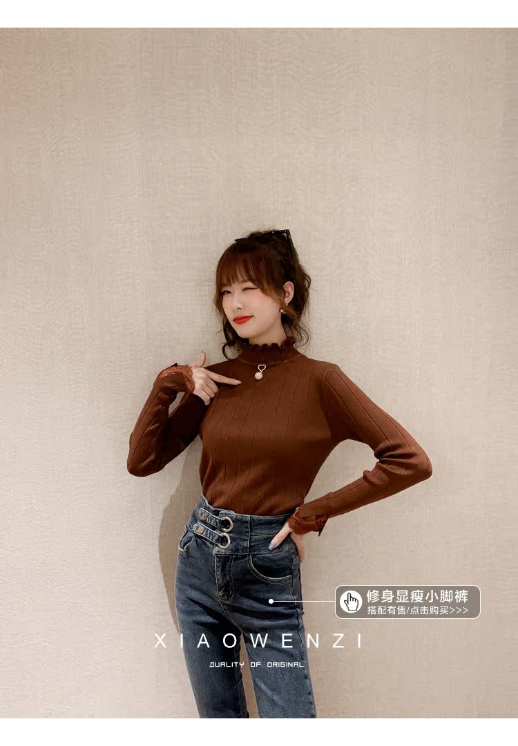 2019女設計感木耳邊蕾絲拼接長袖上衣休閑百搭針織打底衫1入