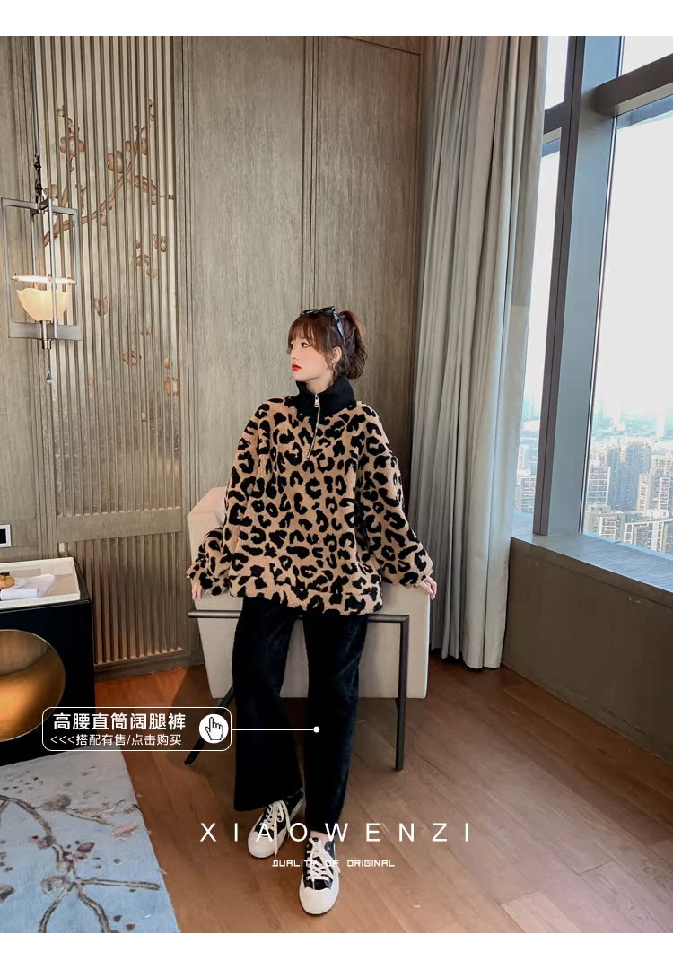 2019女拉鏈立領套頭羊羔毛衛衣韓版寬松豹紋外套長袖上衣1入