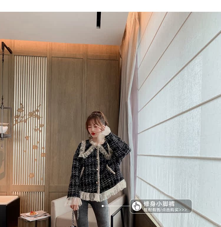 2019秋裝小香風粗花呢網紗拼接外套女娃娃領小個子夾克衫上衣1入