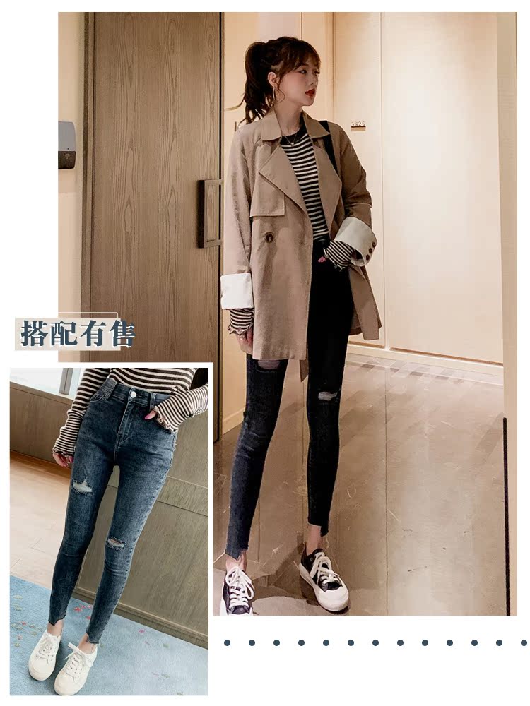 風衣女2019秋季中長款小個子外套韓版寬松翻領卡其色抽繩收腰風衣1入