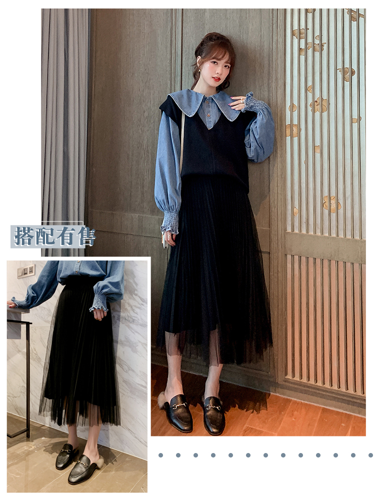 2019秋季韓版娃娃領牛仔襯衫+v領針織馬甲兩件套女減齡套裝潮1入