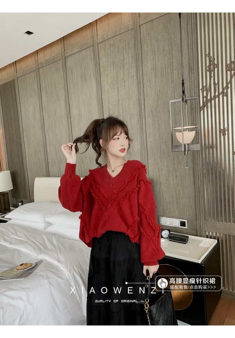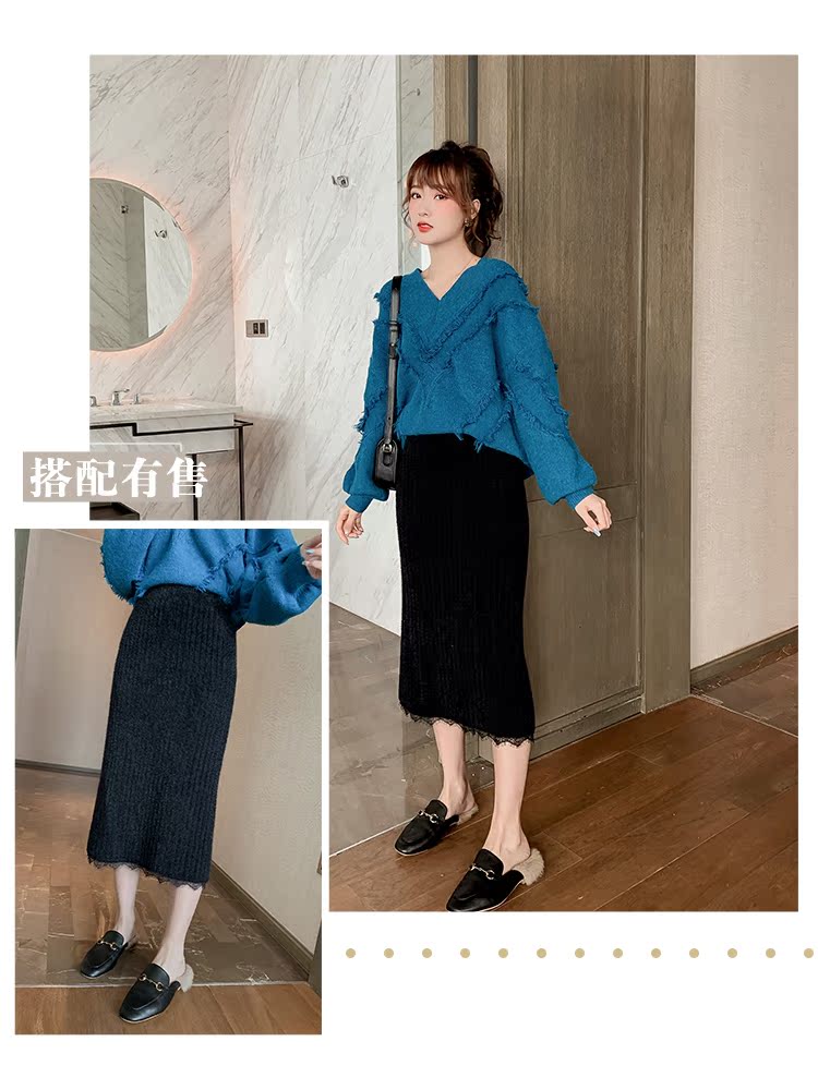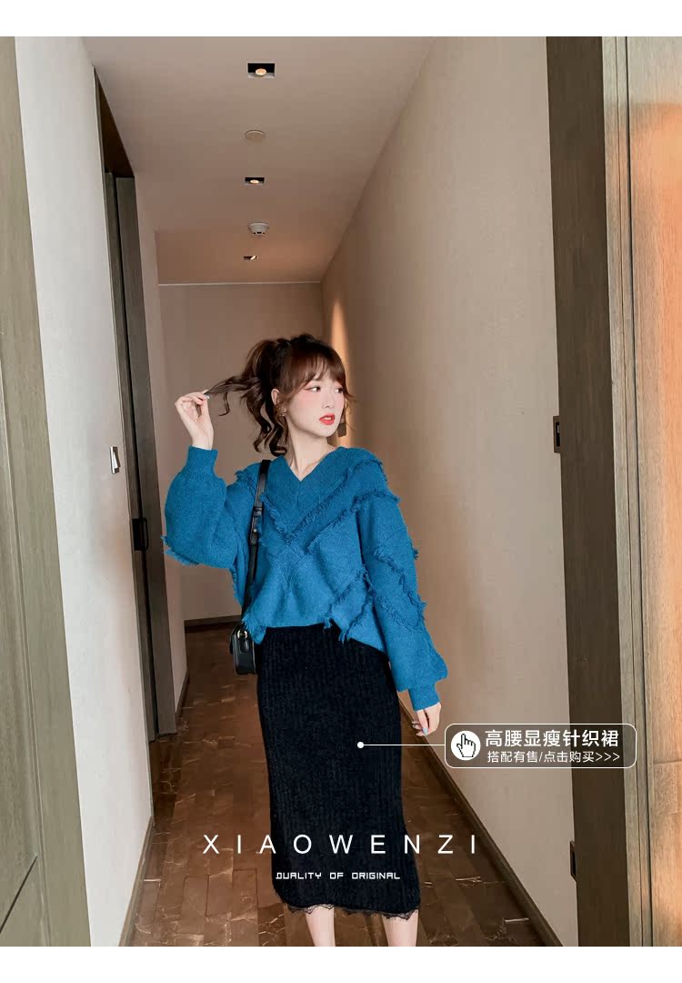 2019百搭流蘇毛衣女韓版寬松v領慵懶風套頭外穿針織毛衣1入