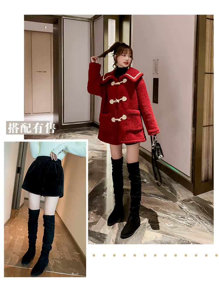 2019冬季女韓版寬松娃娃領長袖上衣羊羔毛加厚外套牛角扣大衣1入