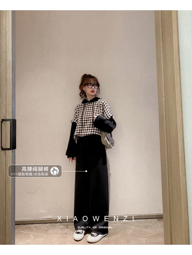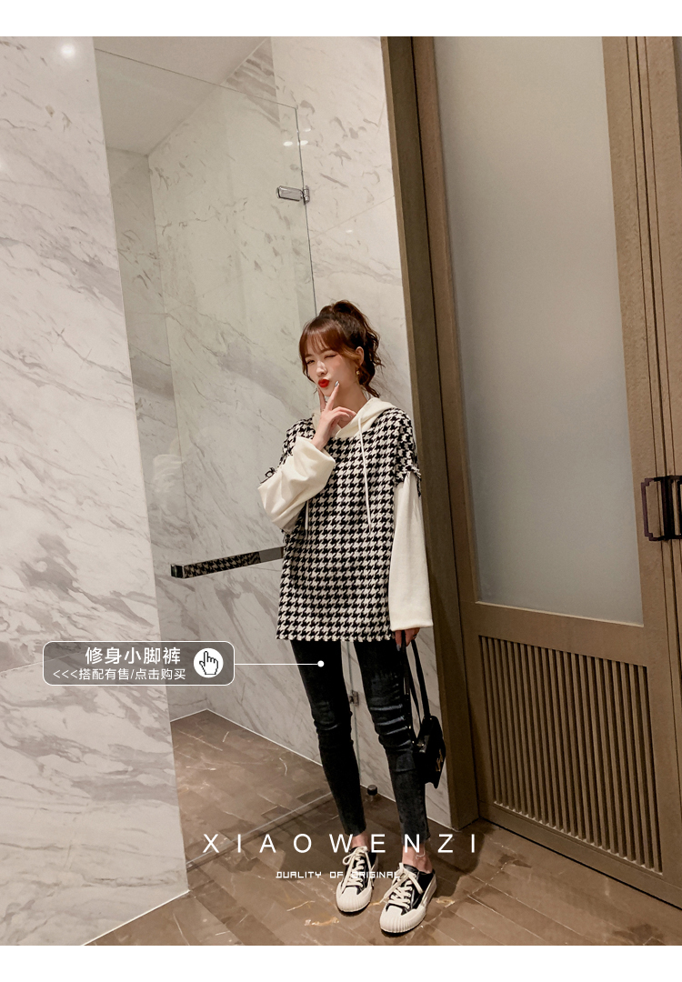 2019秋裝韓版寬松千鳥格拼接外套上衣女設計感連帽套頭衛衣衫1入