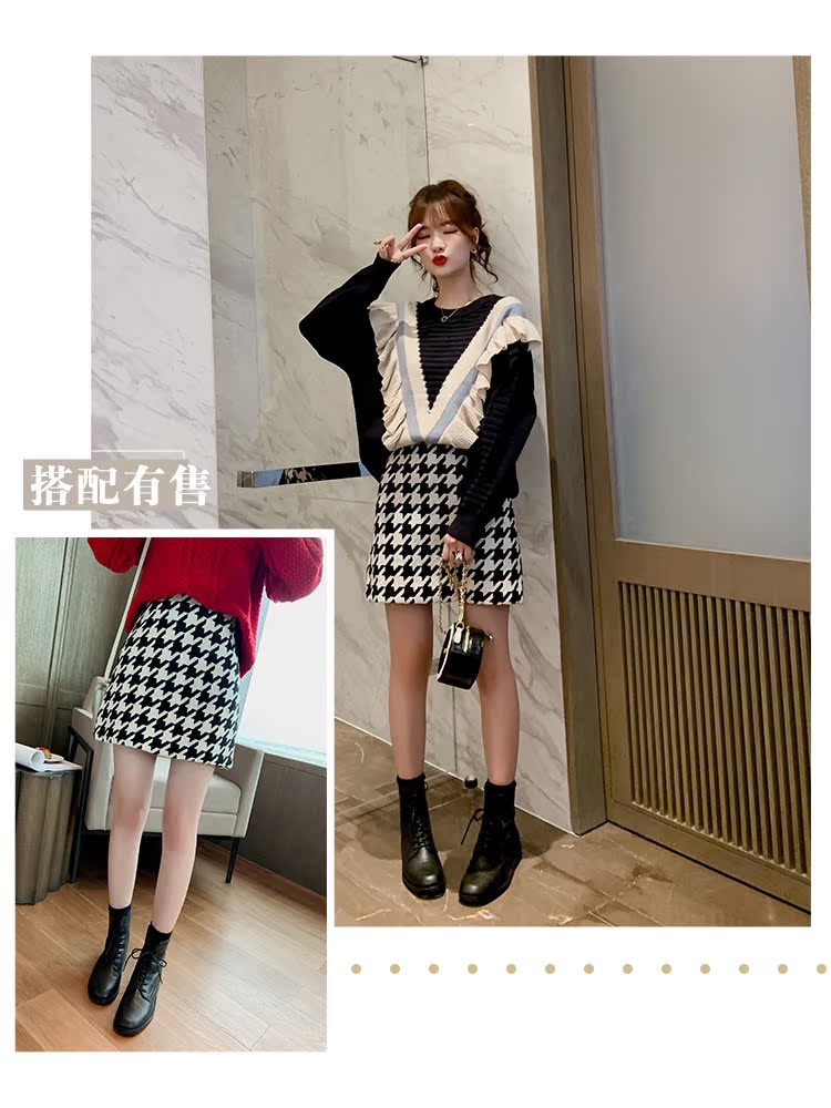 2019設計感木耳邊撞色拼接針織毛衣衫女韓版寬松長袖上衣1入