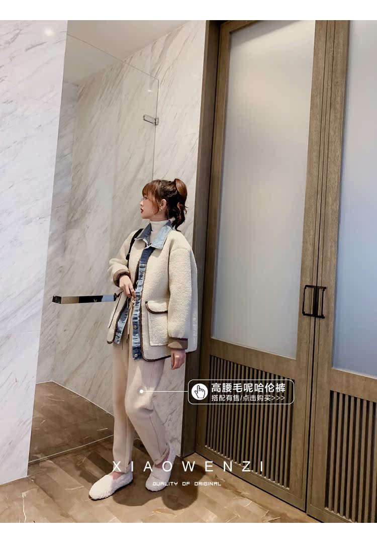 2019冬季女皮毛一體牛仔拼接仿羊羔毛外套韓版寬松bf夾克上衣1入