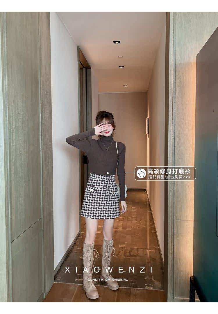 2019女毛呢半身裙復古高腰千鳥格裙修身a字包臀裙短裙子1入