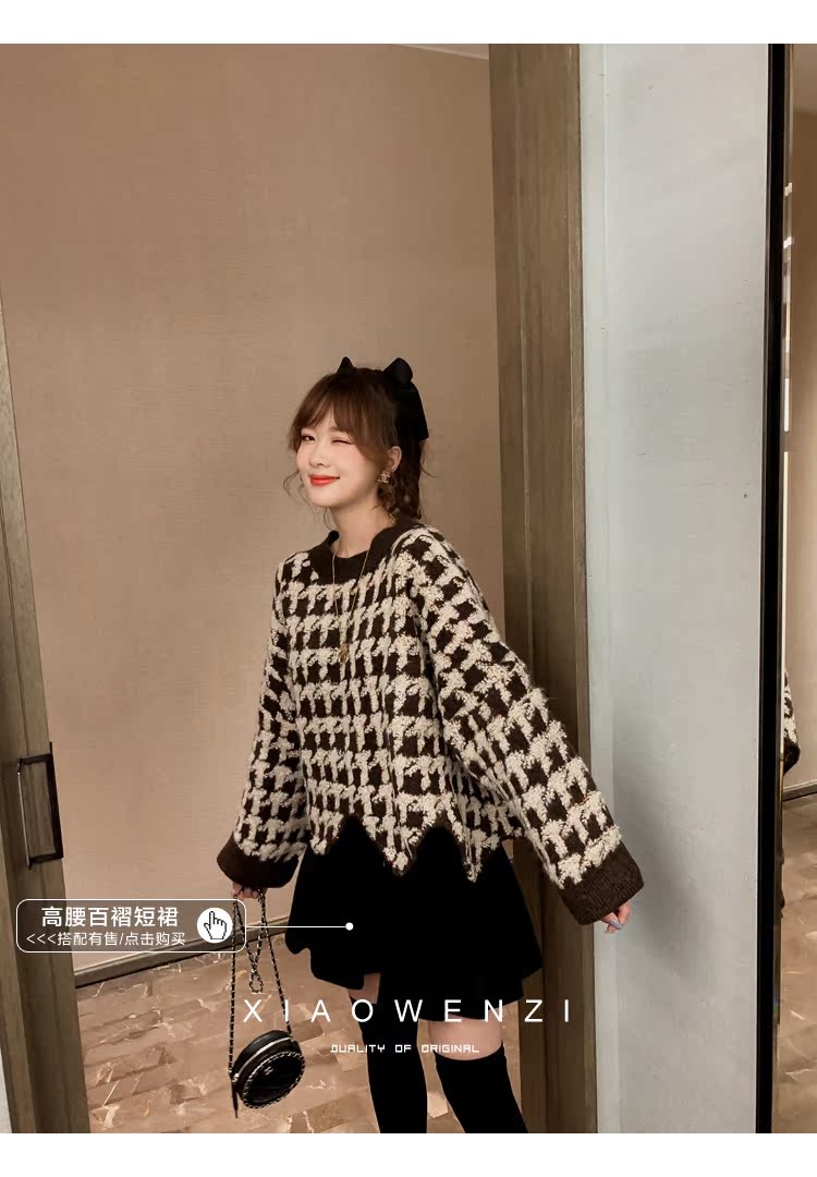 2019千鳥格慵懶風不規則毛衣女短款加厚韓版寬松長袖上衣1入