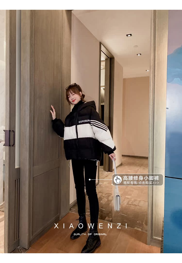 2019冬季韓版寬松面包服女撞色連帽棉襖上衣加厚百搭棉衣外套1入
