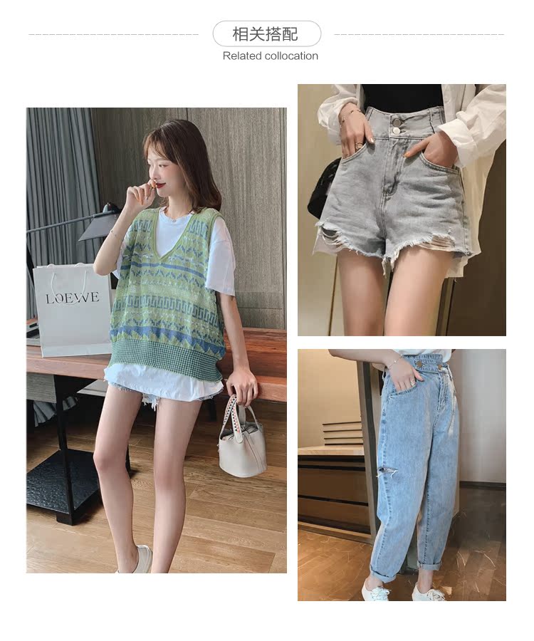 韓版寬松t恤時尚拼色v領馬甲上衣套裝女2019顯瘦氣質兩件套潮1入