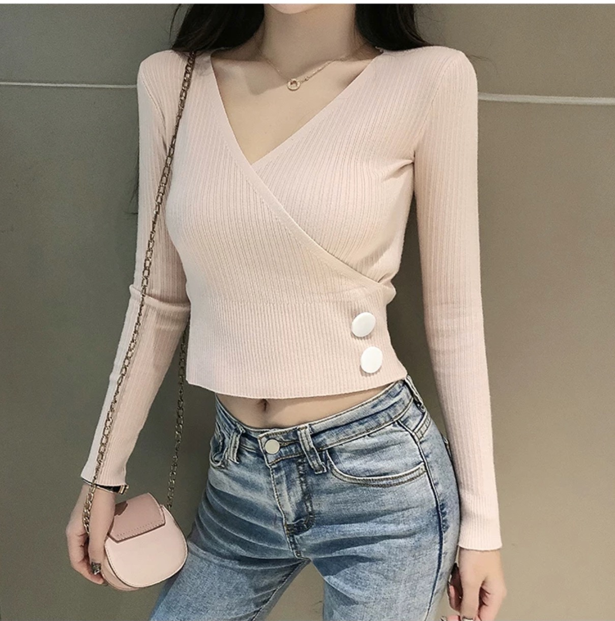 2019網紅長袖針織打底衫薄款初秋v領緊身上衣女毛衣ins潮1入