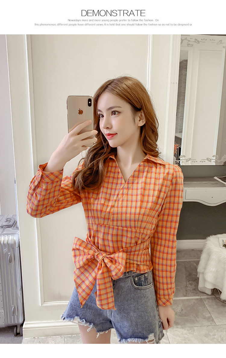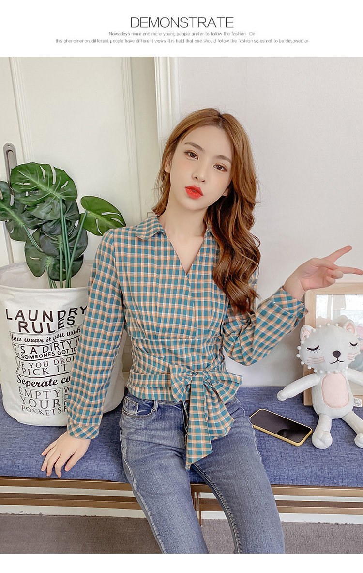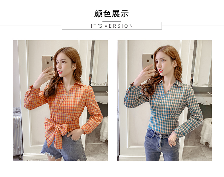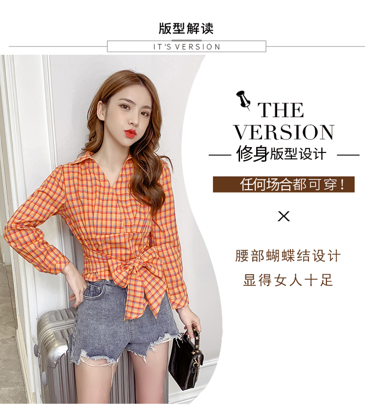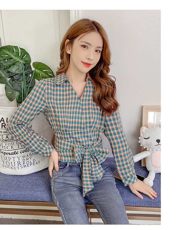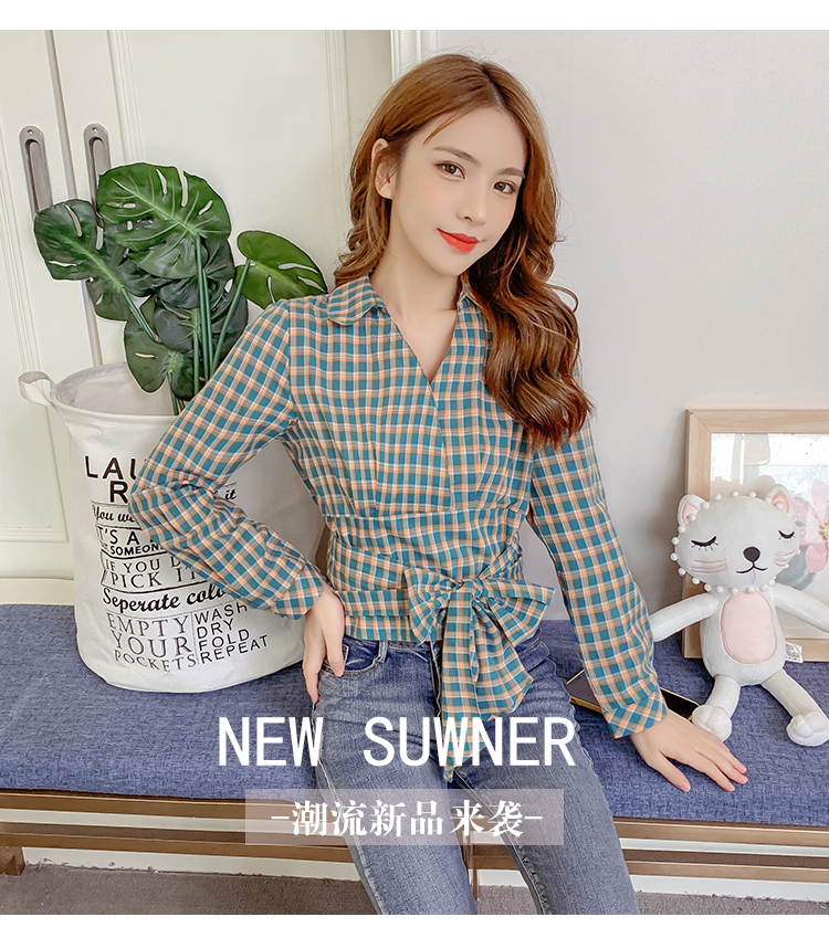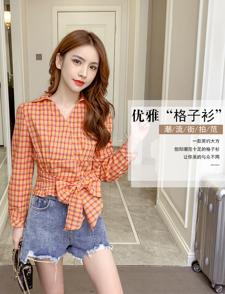 2019秋季復古港味格子襯衫女長袖收腰顯瘦蝴蝶結系帶短款上衣1入