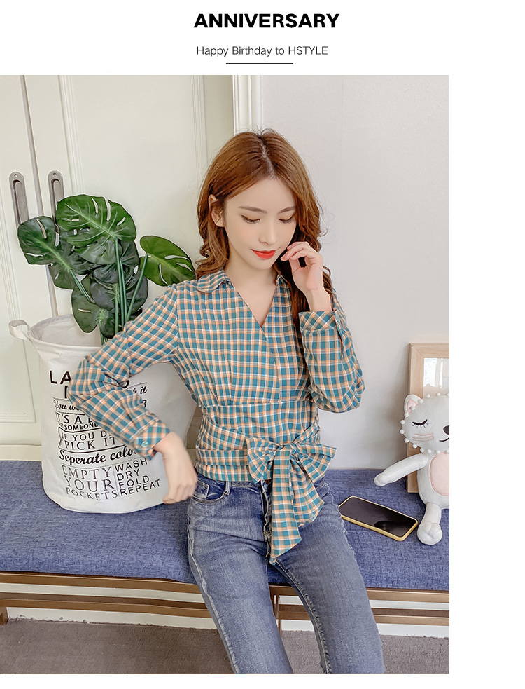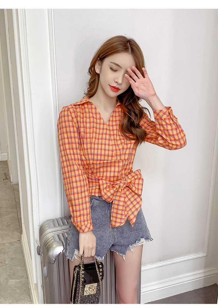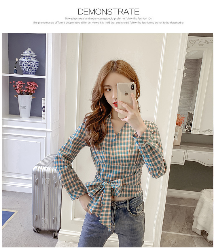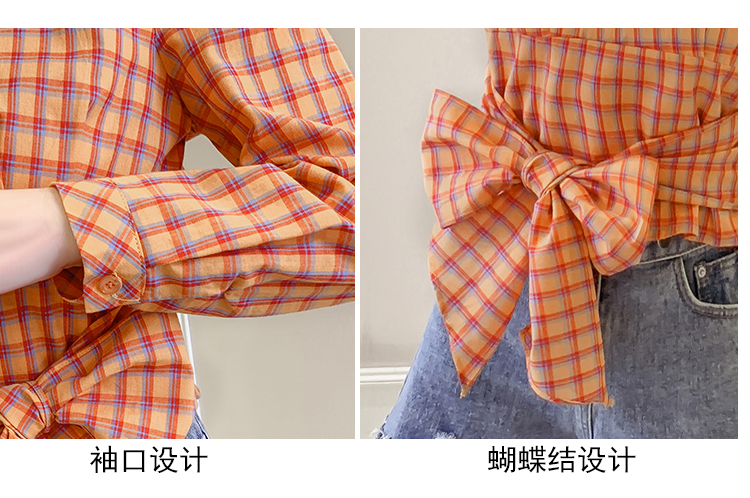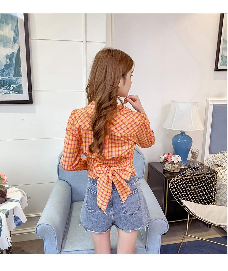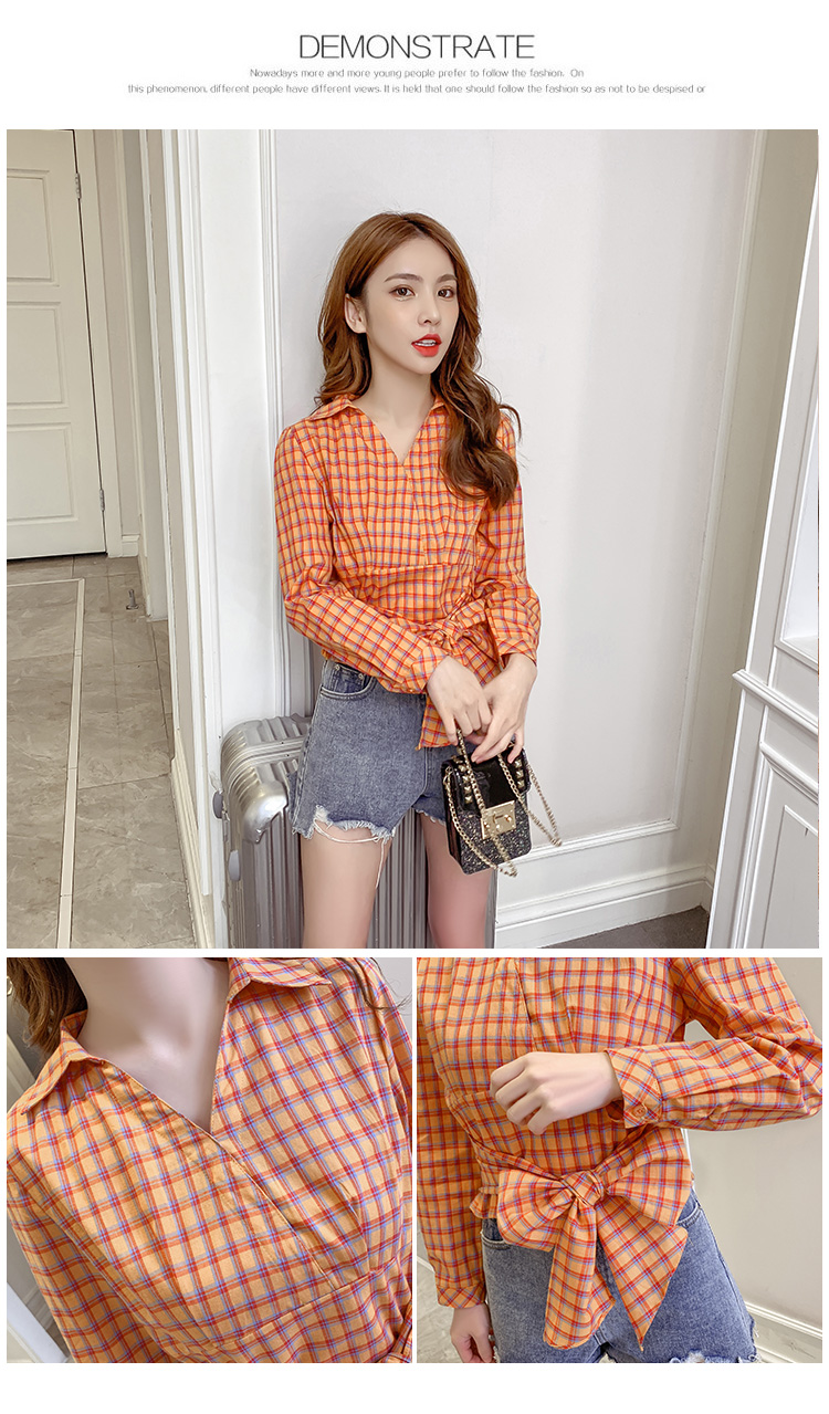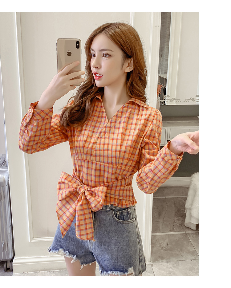 2019秋季復古港味格子襯衫女長袖收腰顯瘦蝴蝶結系帶短款上衣1入