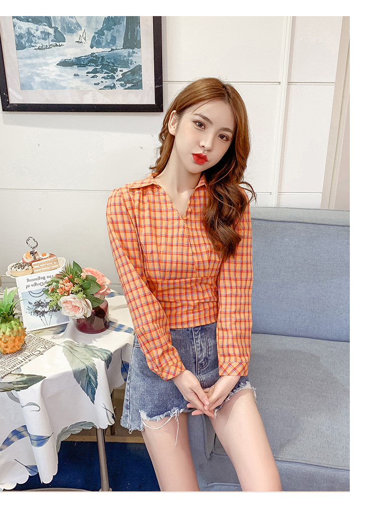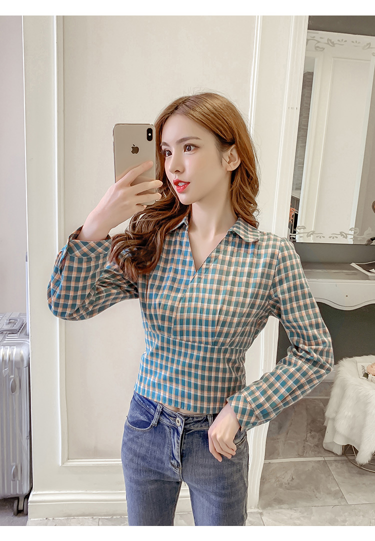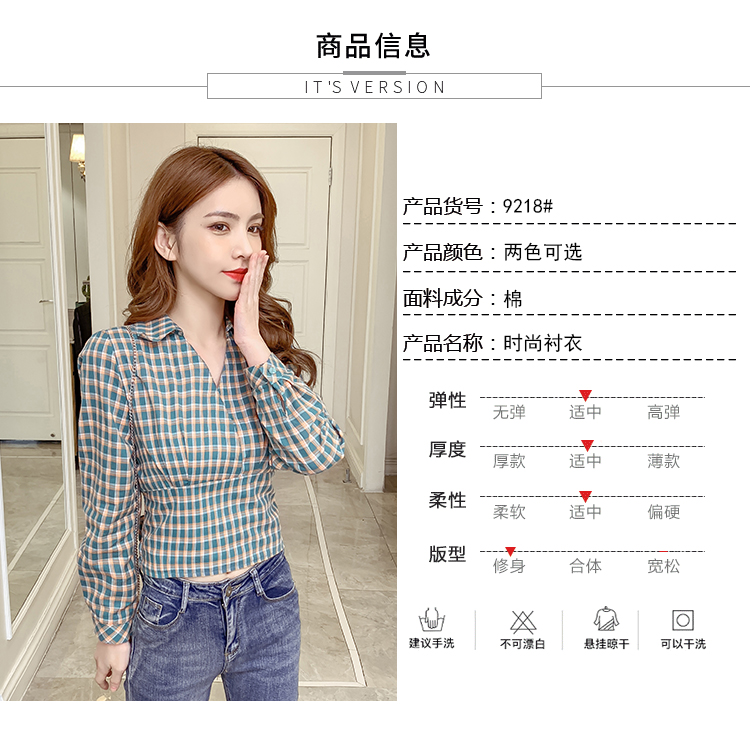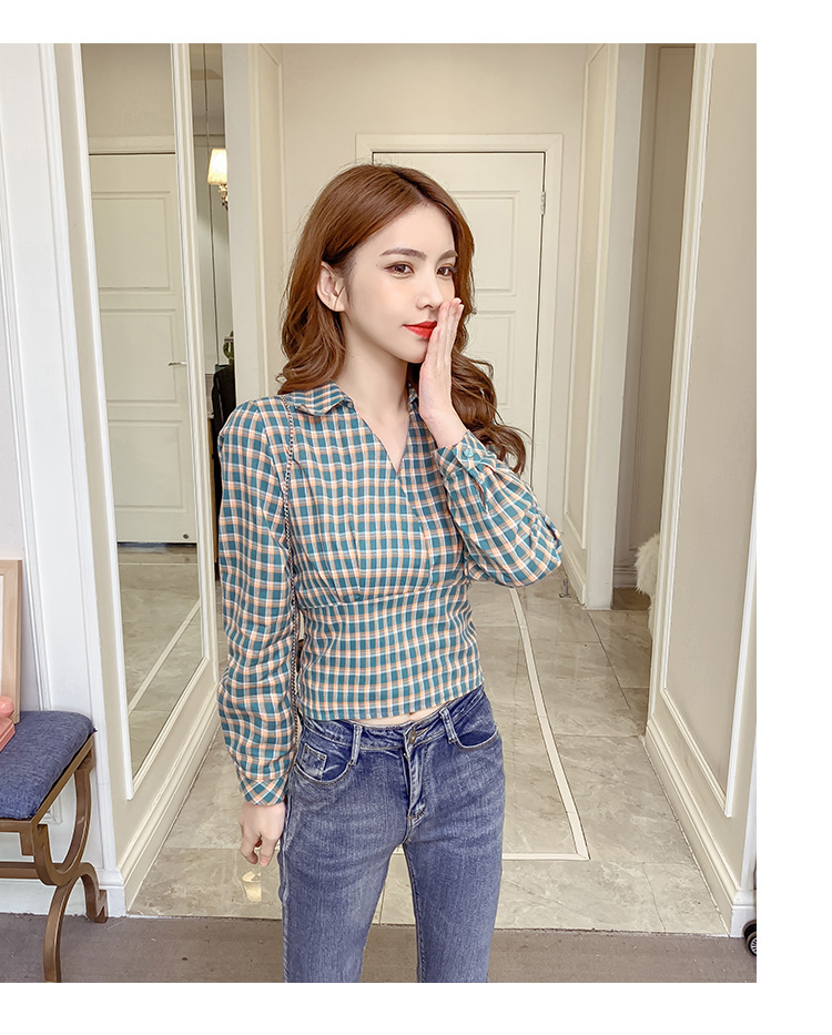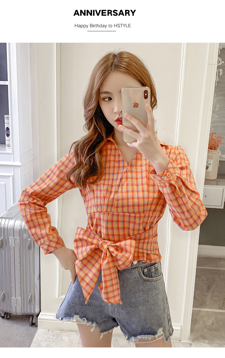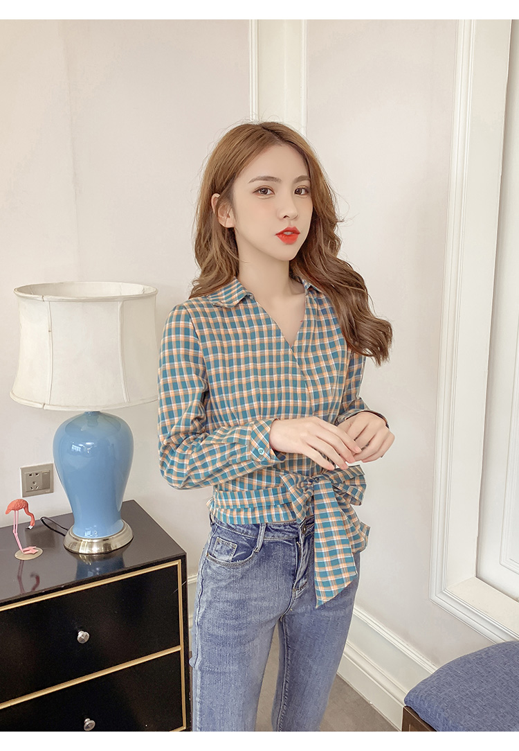 2019秋季復古港味格子襯衫女長袖收腰顯瘦蝴蝶結系帶短款上衣1入