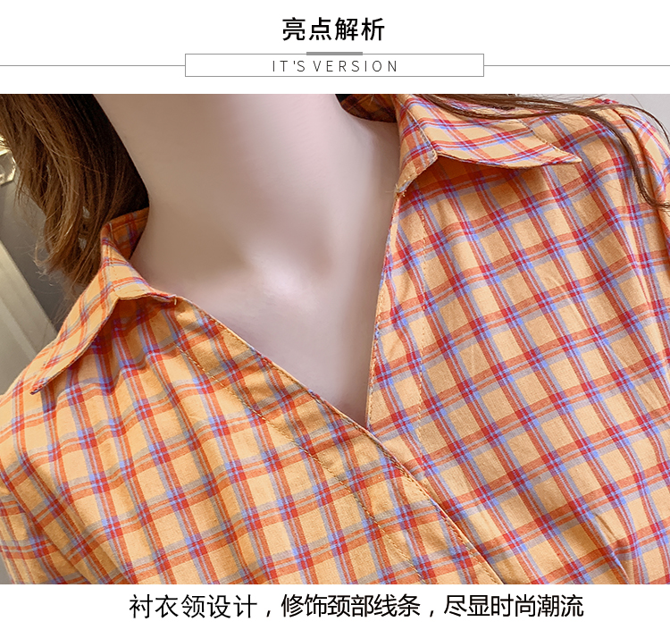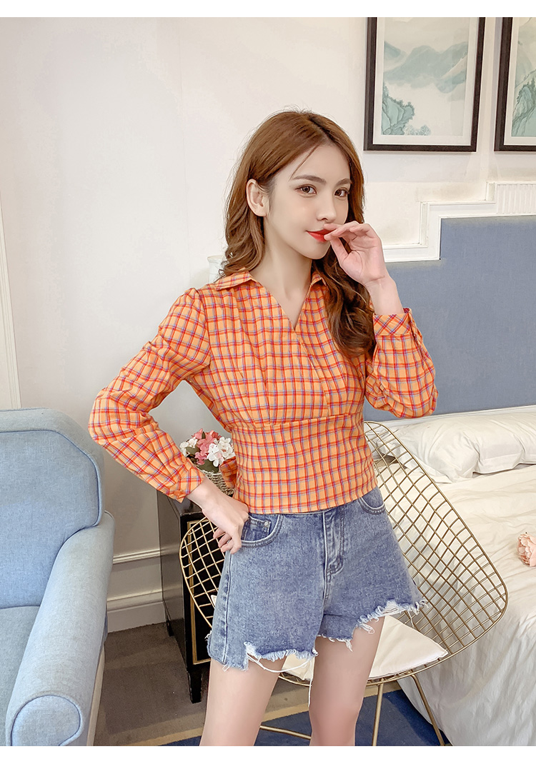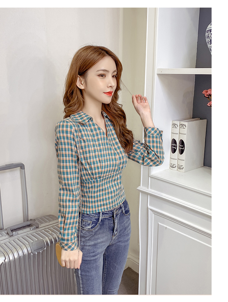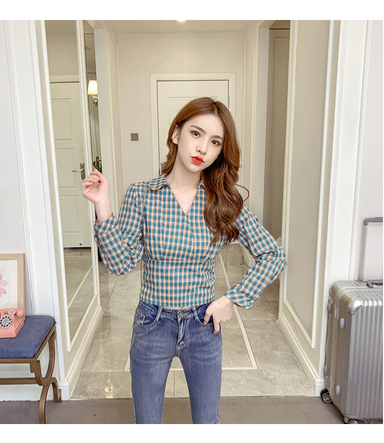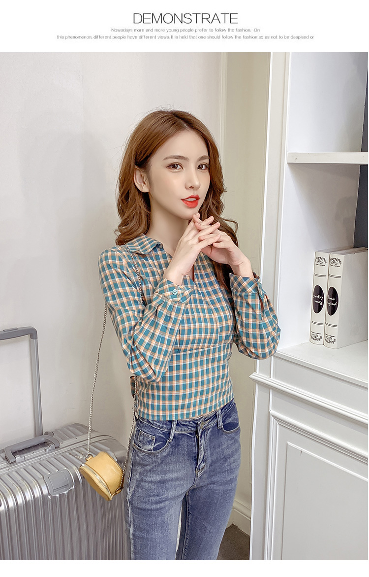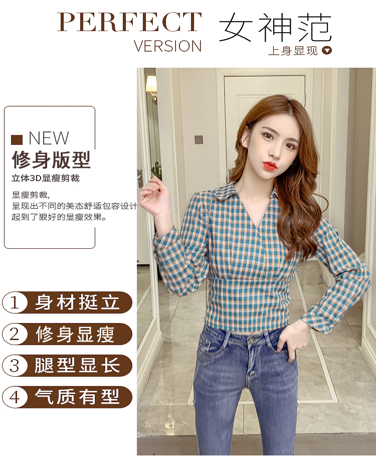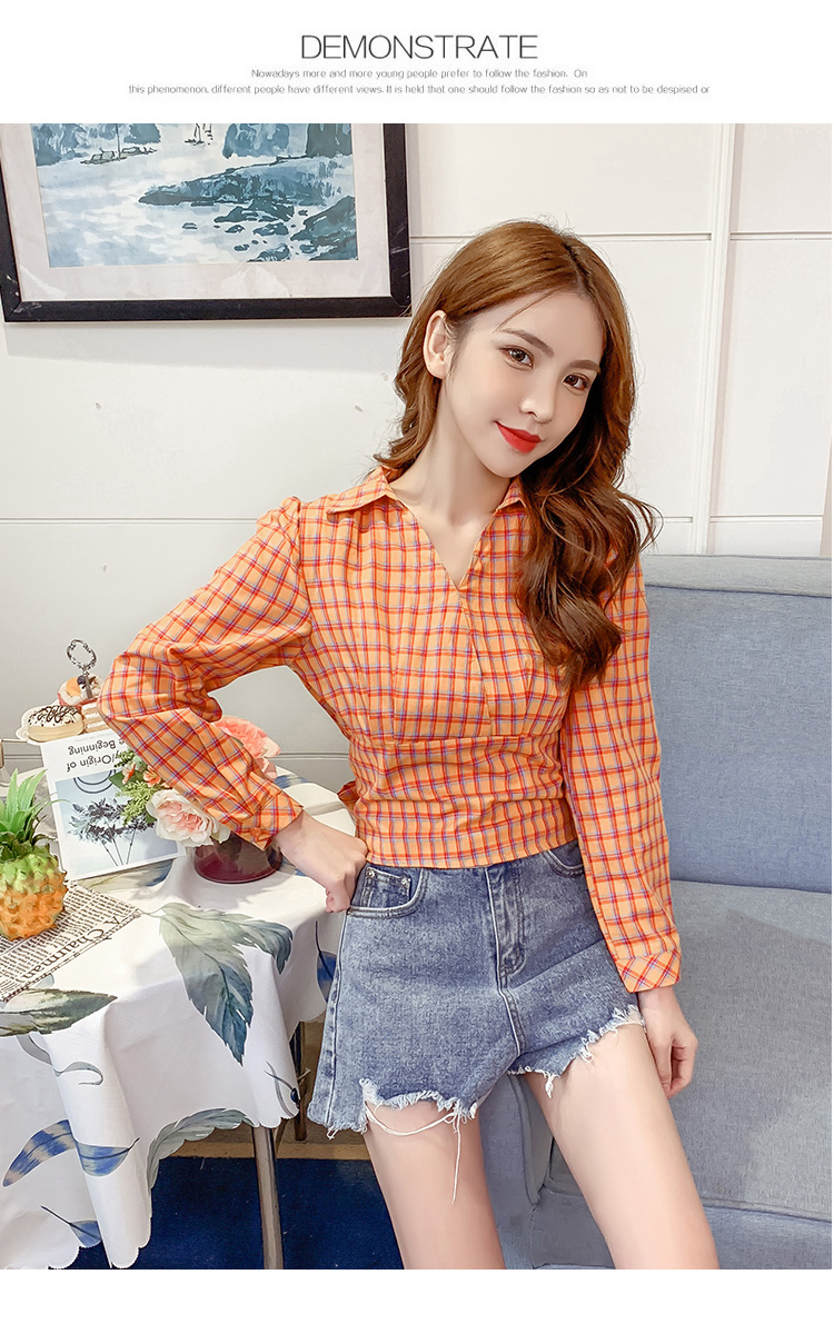 2019秋季復古港味格子襯衫女長袖收腰顯瘦蝴蝶結系帶短款上衣1入