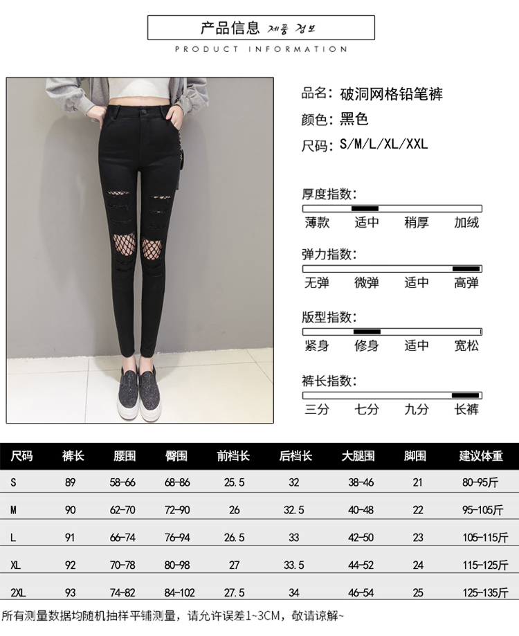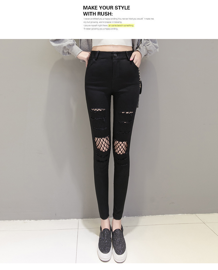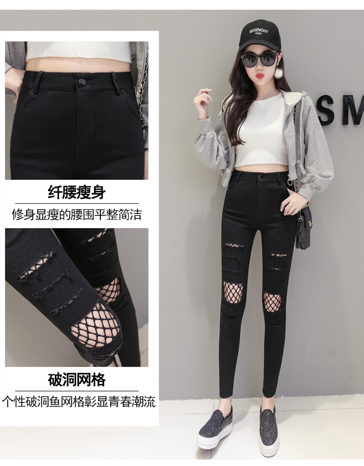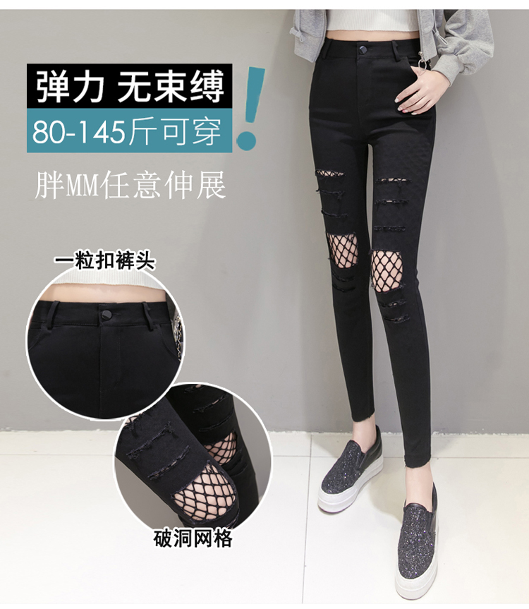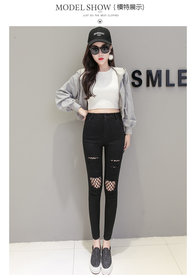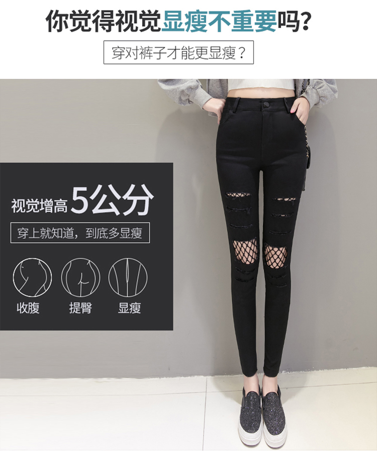 2019春秋破洞漁網仿牛仔打底褲女高腰彈力顯瘦九分小腳鉛筆褲1入
