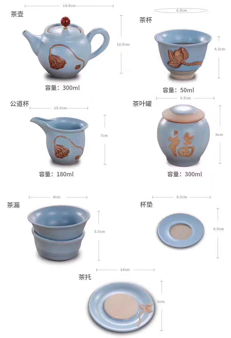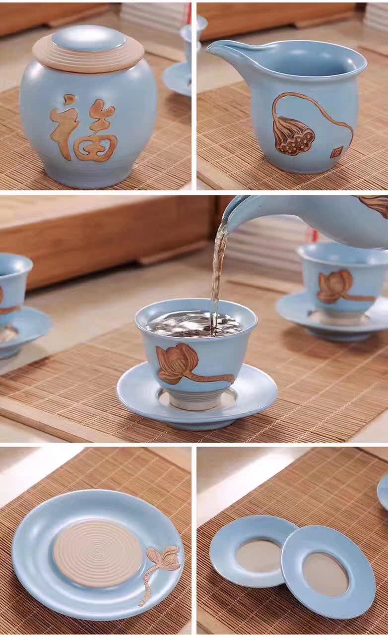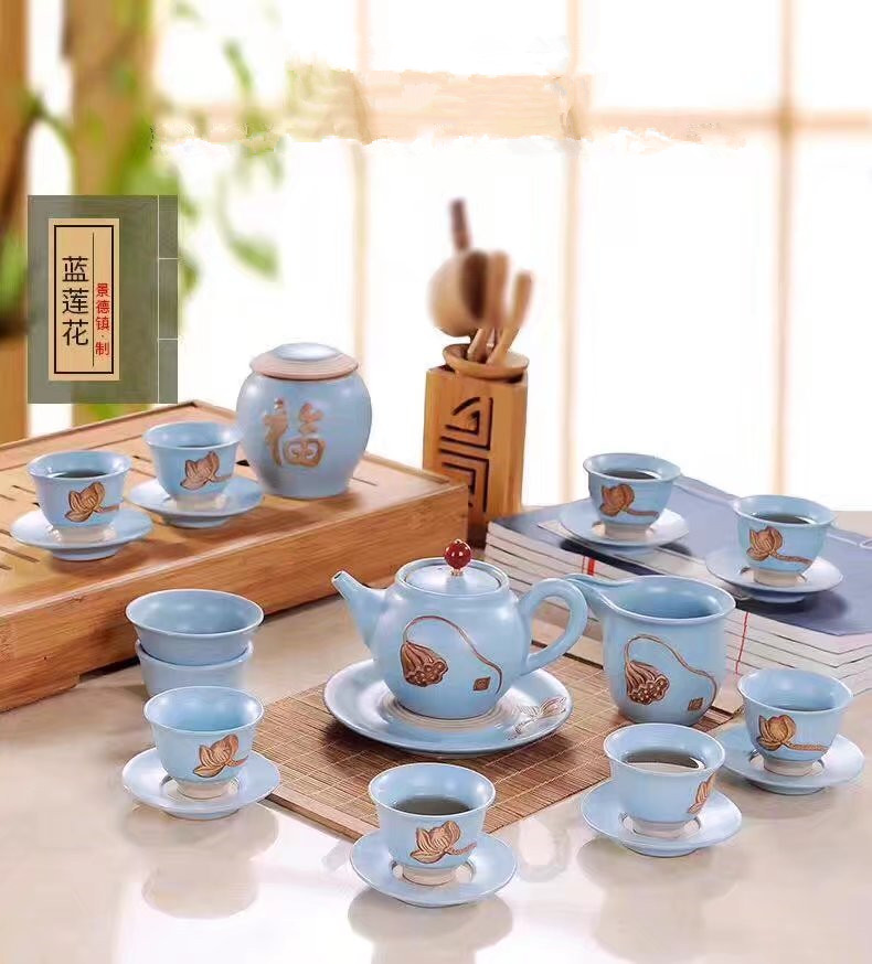 陶瓷汝窯茶具套裝整套功夫茶具藍蓮花茶壺茶杯送禮家用套裝1入
