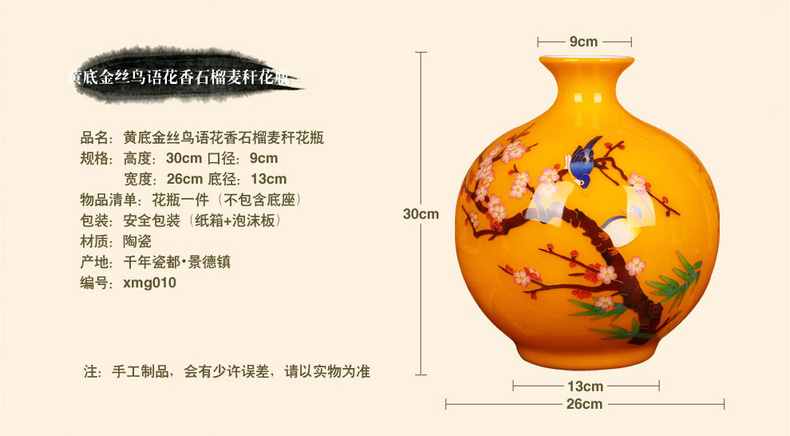 陶瓷器 金絲麥稈黃色喜上眉梢花瓶 中式書房工藝品擺件擺設1入