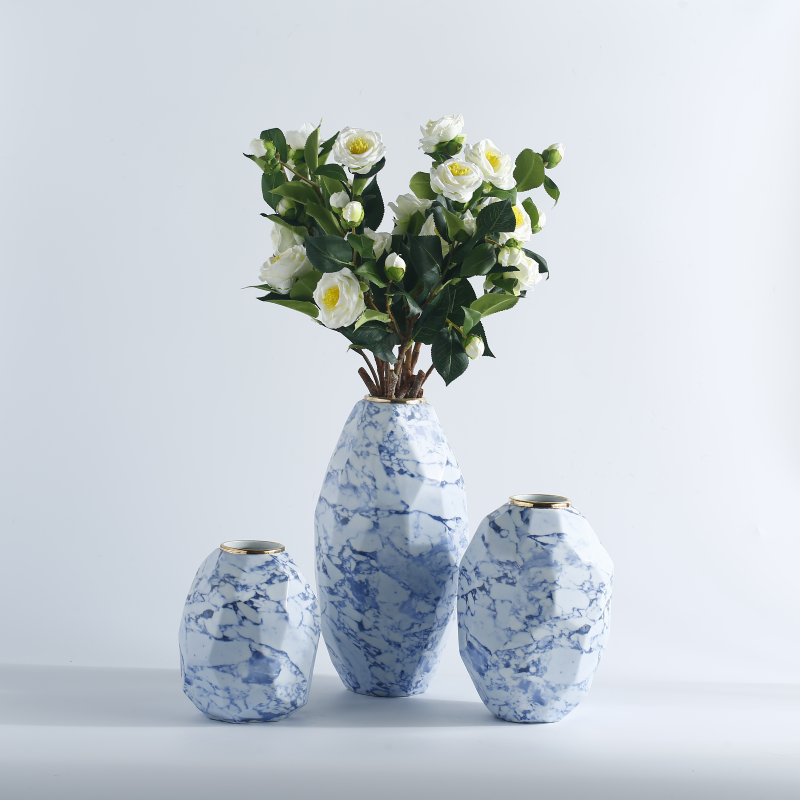 簡約時尚軟裝飾品陶瓷工藝品藍色系列手工貼花花瓶樣板房桌面擺件1入