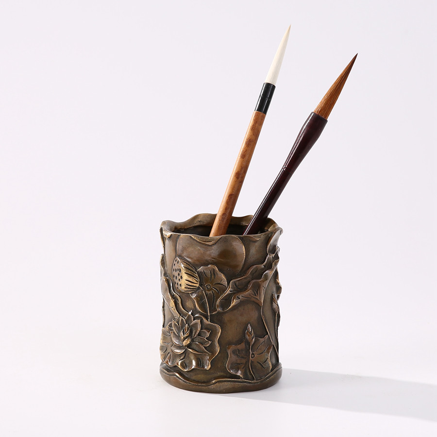樣板間書房桌面擺件純銅荷葉筆筒裝飾品售樓處軟裝小號青銅器擺設1入
