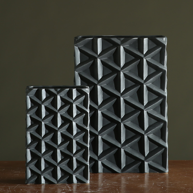 現代網紋幾何藝術設計師花瓶陶瓷花器 黑白色方形花插樣板房擺件1入