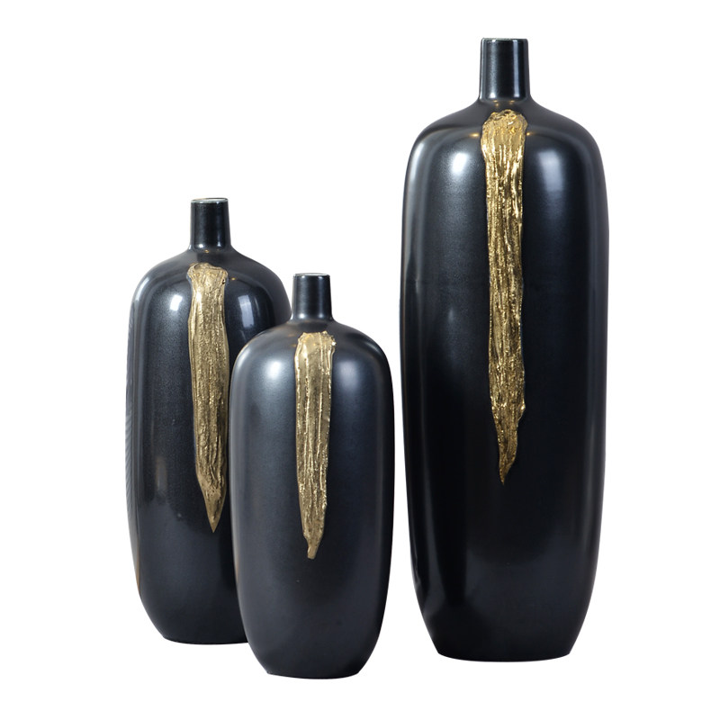 樣板房售樓部裝飾罐家居黑色鎏金陶瓷花瓶現代中式簡美工藝品擺件1入