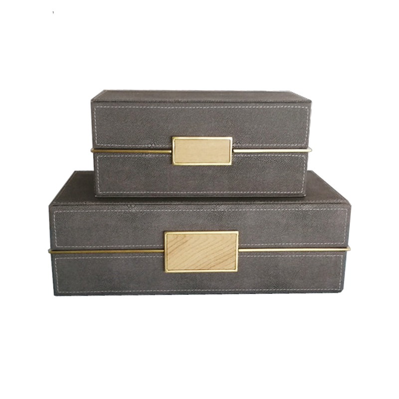 輕奢簡約灰色皮質收納盒金邊方塊長方形裝飾品樣板房臥室軟裝擺設1入