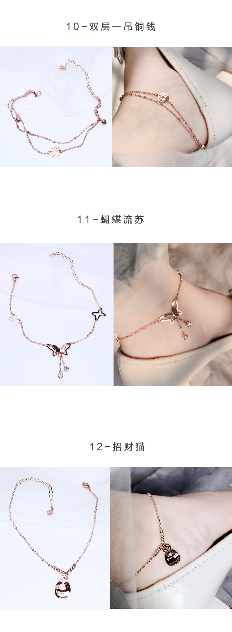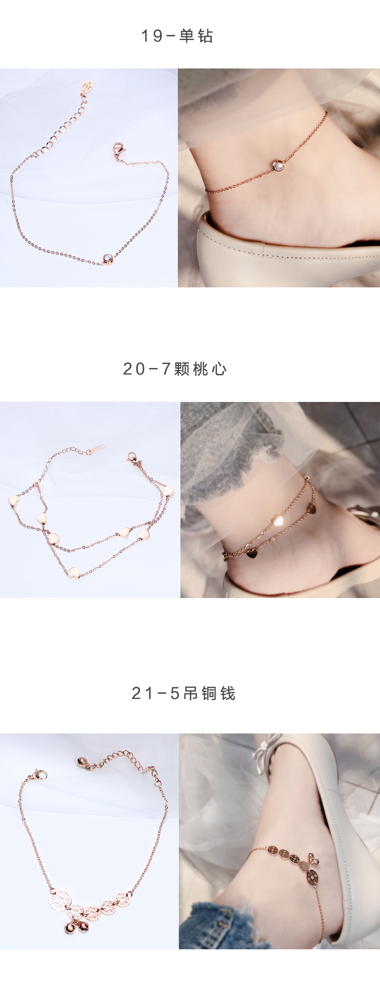 \ \ \ \ 本品為鈦鋼材質,爐內三層電鍍玫瑰金,同款網上很多價格也很低, \\ \ \ 親們注意,一分價錢一分貨! \\ \ \ 我們的寶貝:無對人體有害金屬,拋光好,淡雅玫瑰金色 \\ \ \ (沒有純粹玫瑰金那么紅,適合更多膚色), \\ \ \ 時尚不俗氣,材質好,鍍金工藝優良,接口細致,不易斷!材質成本翻4倍,絕非普通合金! \\ \ \ \ \ 腳鏈戴上時親們要戴松一些..戴太緊走路時腳腕 \\ 因為肌肉收縮容易把腳鏈給撐斷開。 \\ 另外睡覺時候也不宜佩戴 \\ 在床上扭來扭曲就會扭斷 價格雖然 \\ 便宜但是為了讓它能陪伴我們更長時間 \\ 請加以愛惜! \\ \ \ \ \ \ \ 腳鏈長約:20CM+5CM延長鏈,總長約25CM \\ \ \