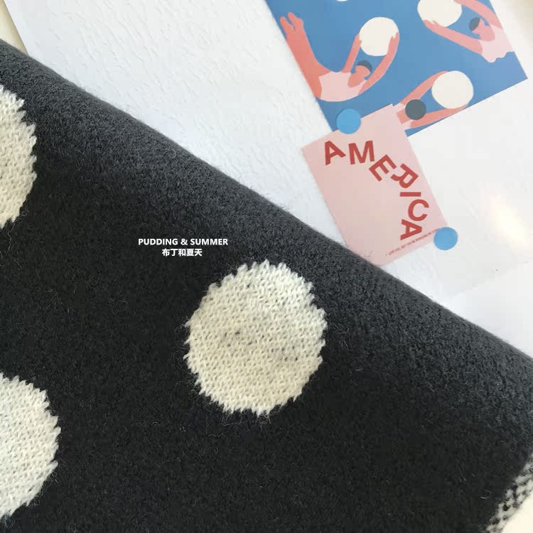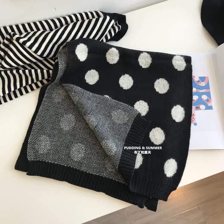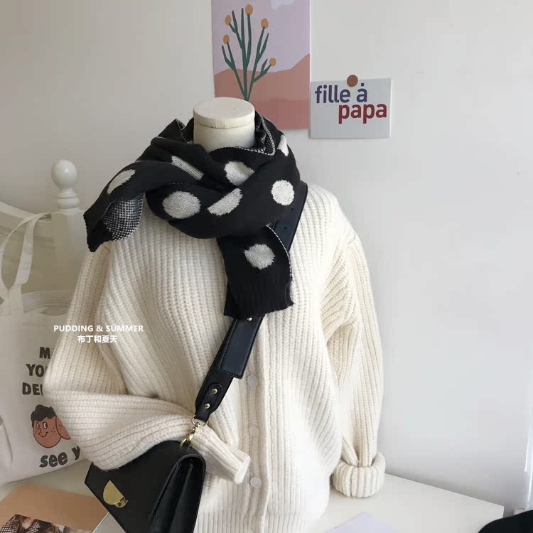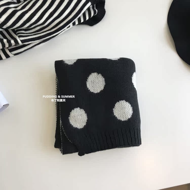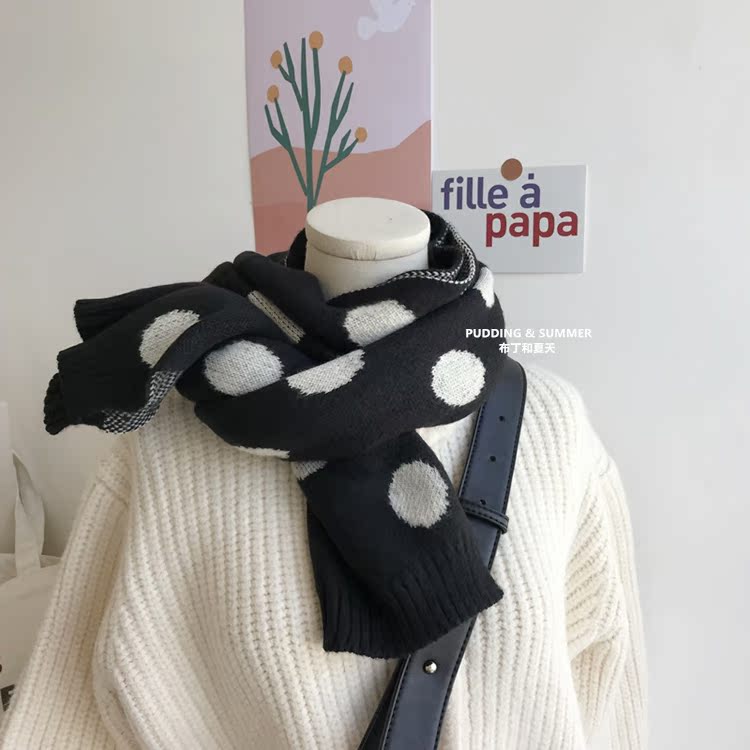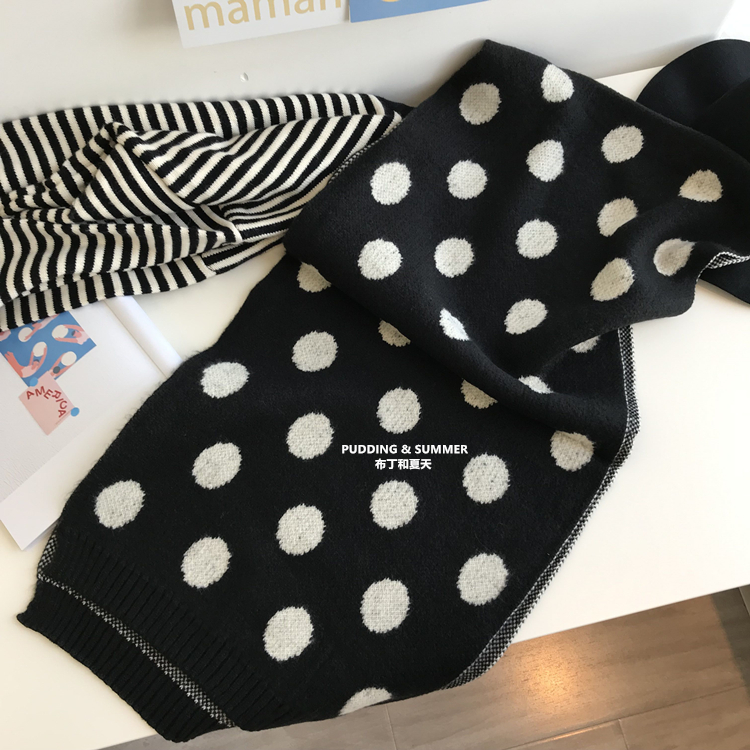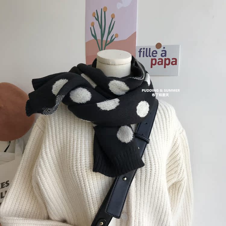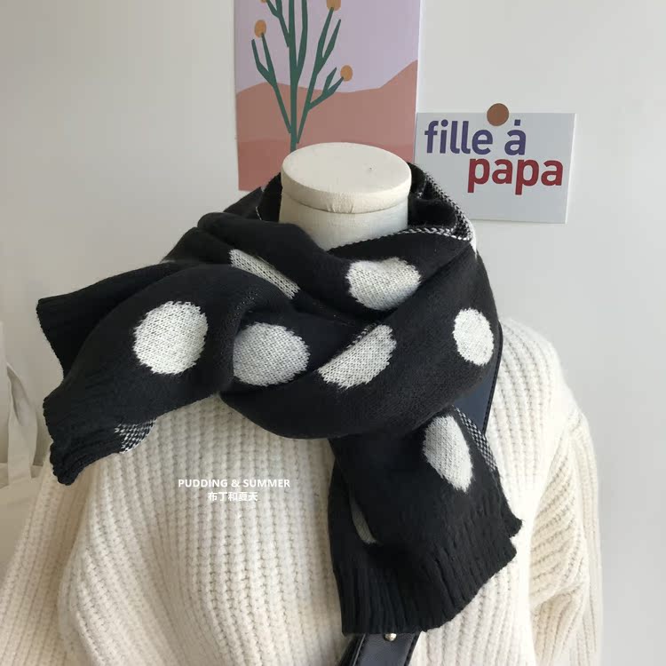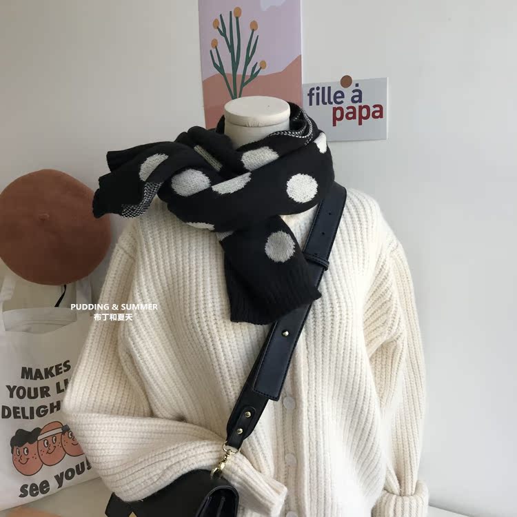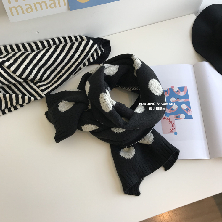 韓版新款時尚可愛黑白大波點圍巾毛線針織保暖ins圍脖學生女1入