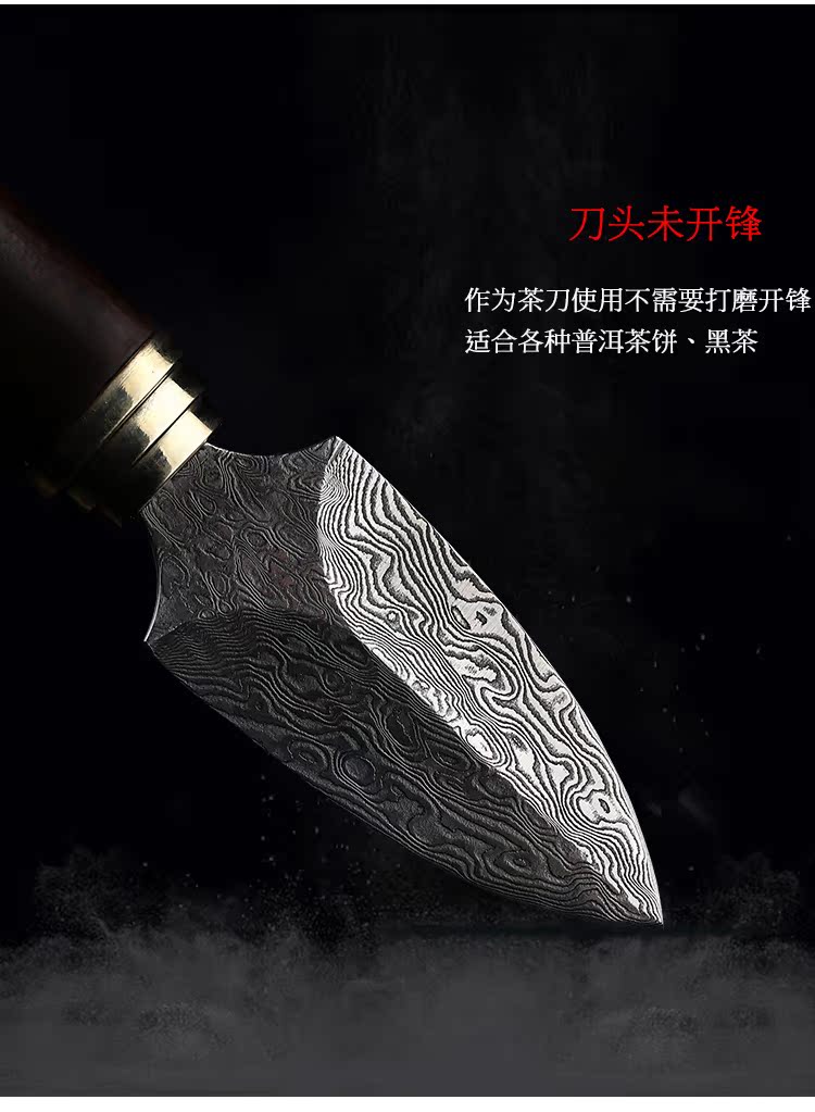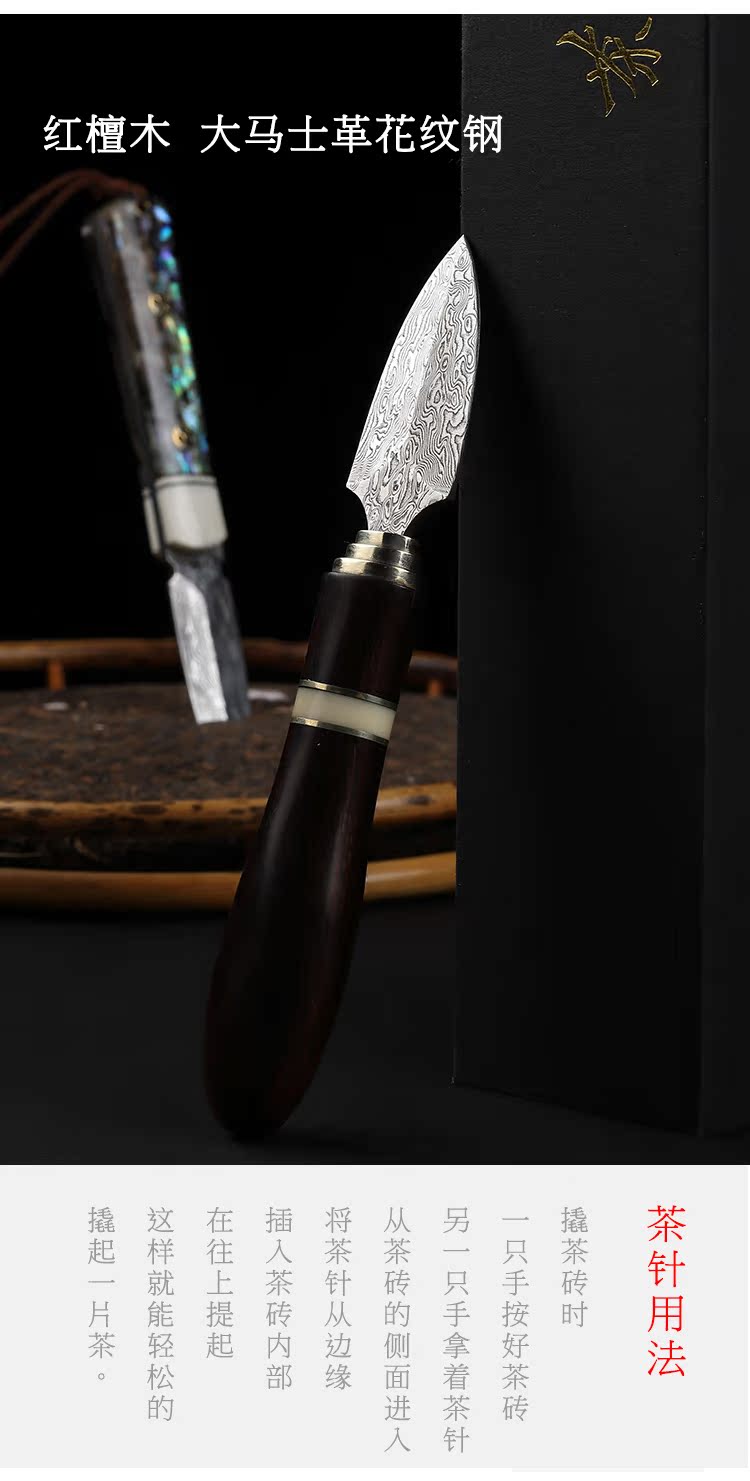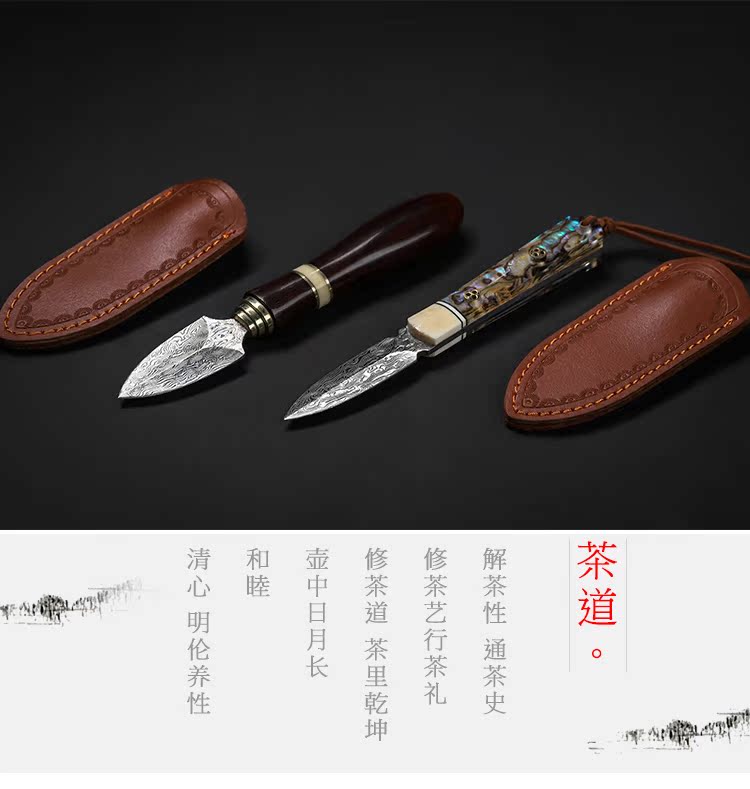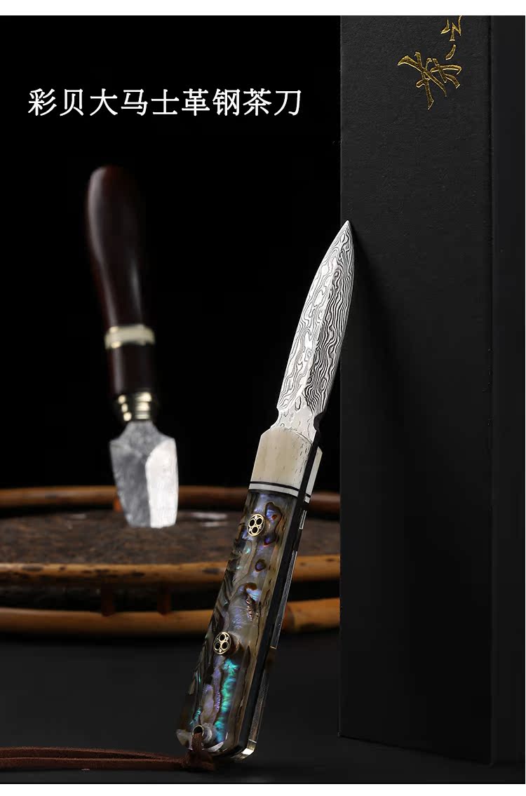 進口大馬士革花紋鋼 黑茶 普洱茶茶刀 茶針實木 彩貝茶具1入