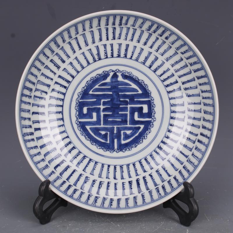 [2]清康熙青花萬壽紋盤手繪仿古老貨中式裝飾瓷器擺件古董古玩收藏1入