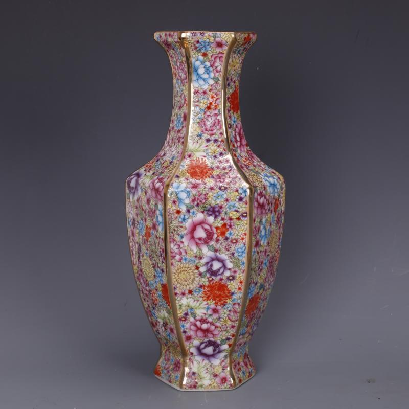 清乾隆琺瑯彩萬花紋六方瓶仿古工藝瓷器家居中式擺件古董古玩收藏1入