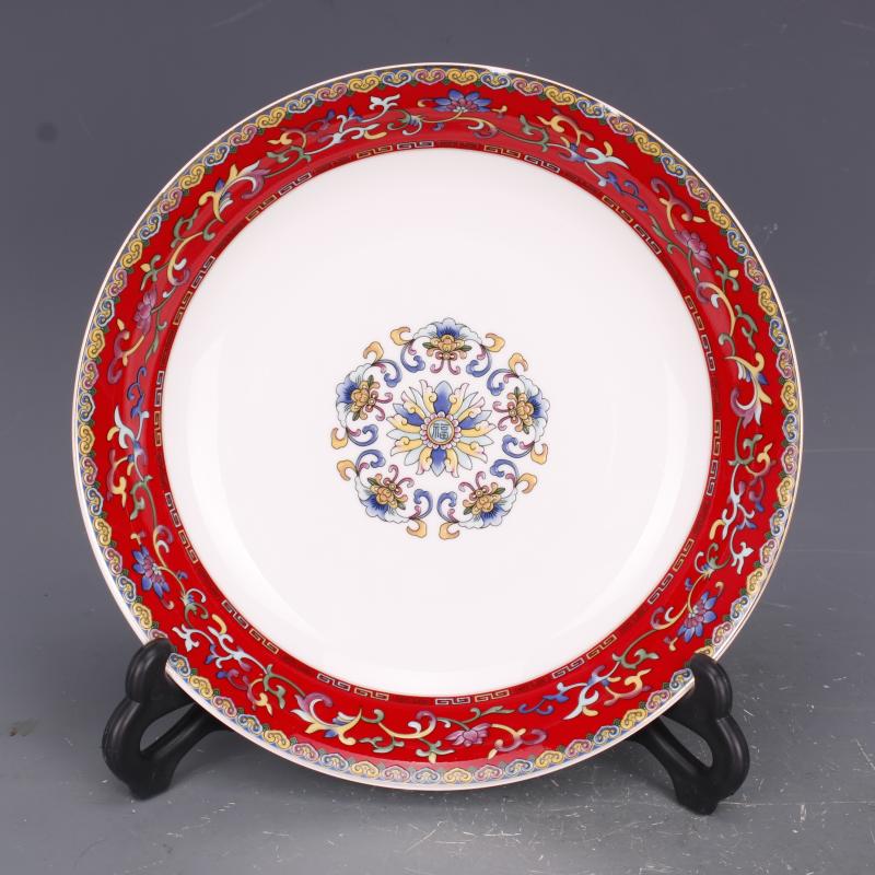 清乾隆粉彩紅纏枝花紋盤仿古工藝品家居博古中式擺件古董古玩收藏1入