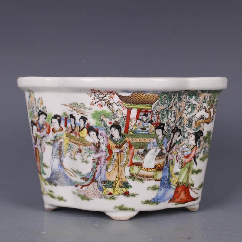 民國粉彩人物花口花盆民間收藏家居裝飾花卉擺件仿古瓷器古董古玩1入