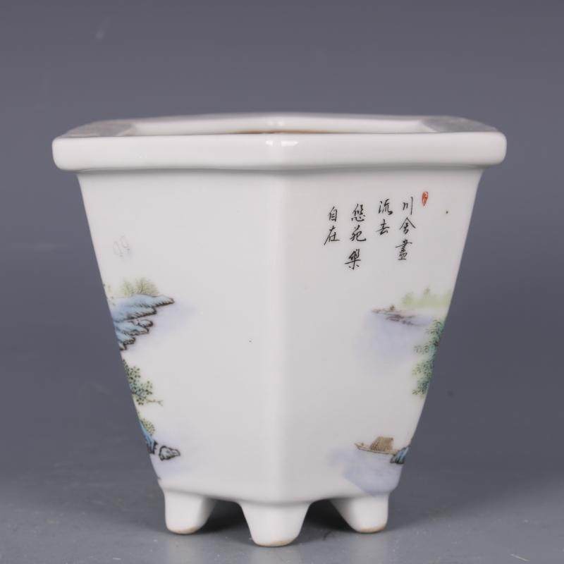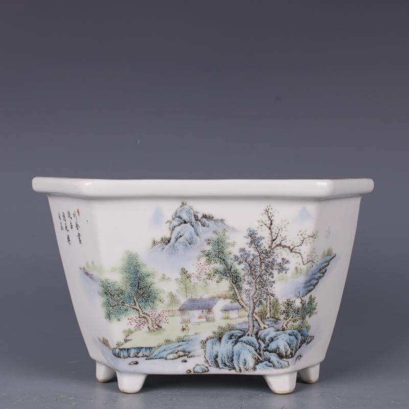 民國粉彩山水六方花盆民間收藏家居裝飾花卉擺件仿古瓷器古董古玩1入