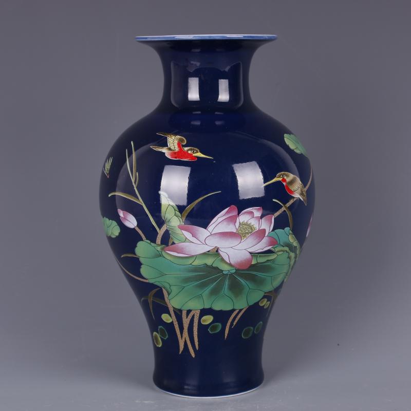 清乾隆藍地粉彩荷花花鳥魚尾瓶仿古中式家居瓷器擺件古董古玩收藏1入
