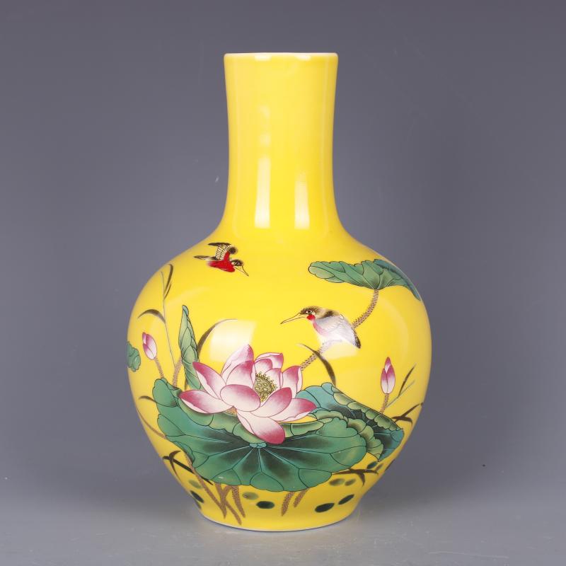 清乾隆黃地粉彩荷花花鳥天球瓶仿古中式家居餐廳瓷器擺件古董古玩1入